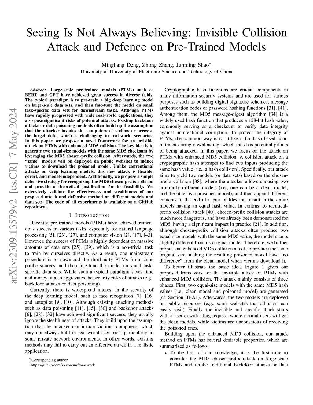 Large-scale pre-trained models (PTMs) such as BERT and GPT have achieved great success in diverse fields. The typical paradigm is to pre-train a big deep learning model on large-scale data sets, and then fine-tune the model on small task-specific data sets for downstream tasks. Although PTMs have rapidly progressed with wide real-world applications, they also pose significant risks of potential attacks. Existing backdoor attacks or data poisoning methods often build up the assumption that the attacker invades the computers of victims or accesses the target data, which is challenging in real-world scenarios. In this paper, we propose a novel framework for an invisible attack on PTMs with enhanced MD5 collision. The key idea is to generate two equal-size models with the same MD5 checksum by leveraging the MD5 chosen-prefix collision. Afterwards, the two ``same" models will be deployed on public websites to induce victims to download the poisoned model. Unlike conventional attacks on deep learning models, this new attack is flexible, covert, and model-independent. Additionally, we propose a simple defensive strategy for recognizing the MD5 chosen-prefix collision and provide a theoretical justification for its feasibility. We extensively validate the effectiveness and stealthiness of our proposed attack and defensive method on different models and data sets.
