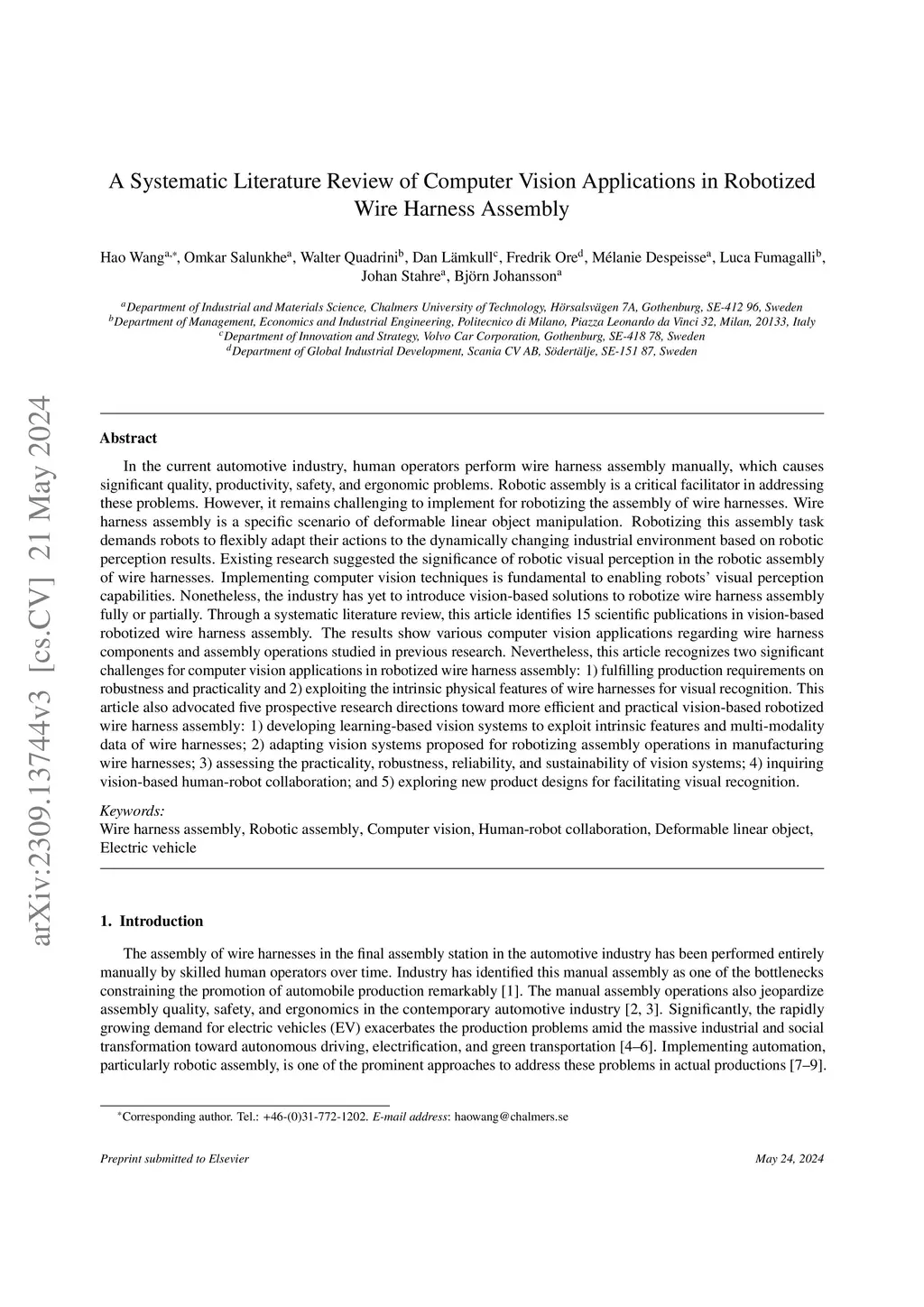 This article provides a systematic literature review of computer vision applications in robotized wire harness assembly.
