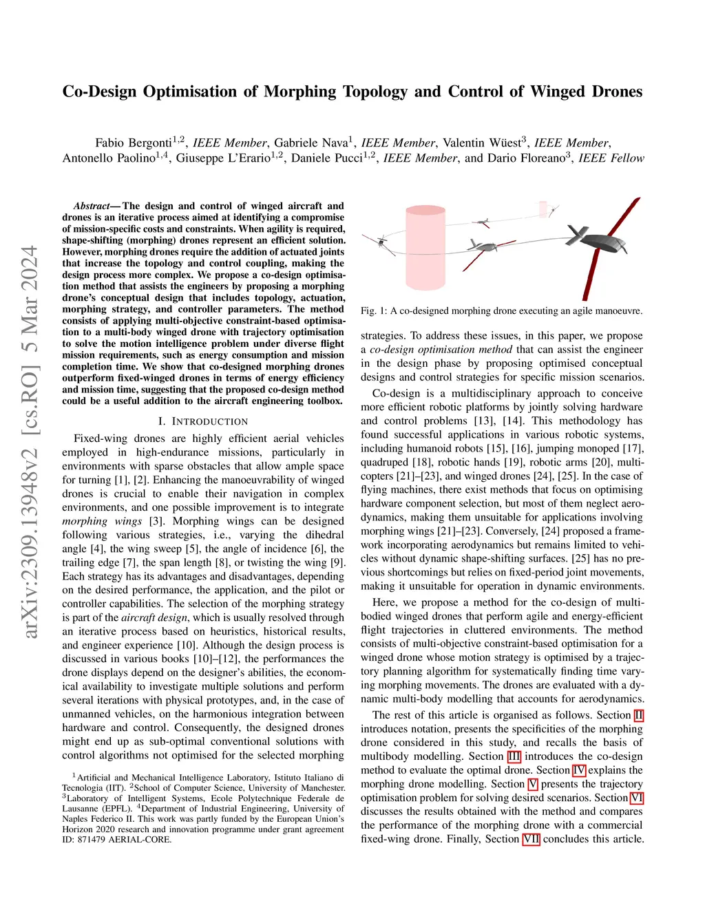 The design and control of winged aircraft and drones is an iterative process aimed at identifying a compromise of mission-specific costs and constraints. When agility is required, shape-shifting (morphing) drones represent an efficient solution. However, morphing drones require the addition of actuated joints that increase the topology and control coupling, making the design process more complex. We propose a co-design optimisation method that assists the engineers by proposing a morphing drone's conceptual design that includes topology, actuation, morphing strategy, and controller parameters. The method consists of applying multi-objective constraint-based optimisation to a multi-body winged drone with trajectory optimisation to solve the motion intelligence problem under diverse flight mission requirements, such as energy consumption and mission completion time. We show that co-designed morphing drones outperform fixed-winged drones in terms of energy efficiency and mission time, suggesting that the proposed co-design method could be a useful addition to the aircraft engineering toolbox.