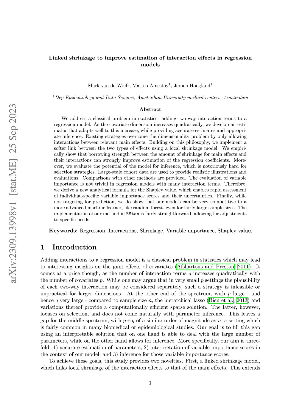We address a classical problem in statistics: adding two-way interaction terms to a regression model. As the covariate dimension increases quadratically, we develop an estimator that adapts well to this increase, while providing accurate estimates and appropriate inference. Existing strategies overcome the dimensionality problem by only allowing interactions between relevant main effects. Building on this philosophy, we implement a softer link between the two types of effects using a local shrinkage model. We empirically show that borrowing strength between the amount of shrinkage for main effects and their interactions can strongly improve estimation of the regression coefficients. Moreover, we evaluate the potential of the model for inference, which is notoriously hard for selection strategies. Large-scale cohort data are used to provide realistic illustrations and evaluations. Comparisons with other methods are provided. The evaluation of variable importance is not trivial in regression models with many interaction terms. Therefore, we derive a new analytical formula for the Shapley value, which enables rapid assessment of individual-specific variable importance scores and their uncertainties. Finally, while not targeting for prediction, we do show that our models can be very competitive to a more advanced machine learner, like random forest, even for fairly large sample sizes. The implementation of our method in RStan is fairly straightforward, allowing for adjustments to specific needs.
