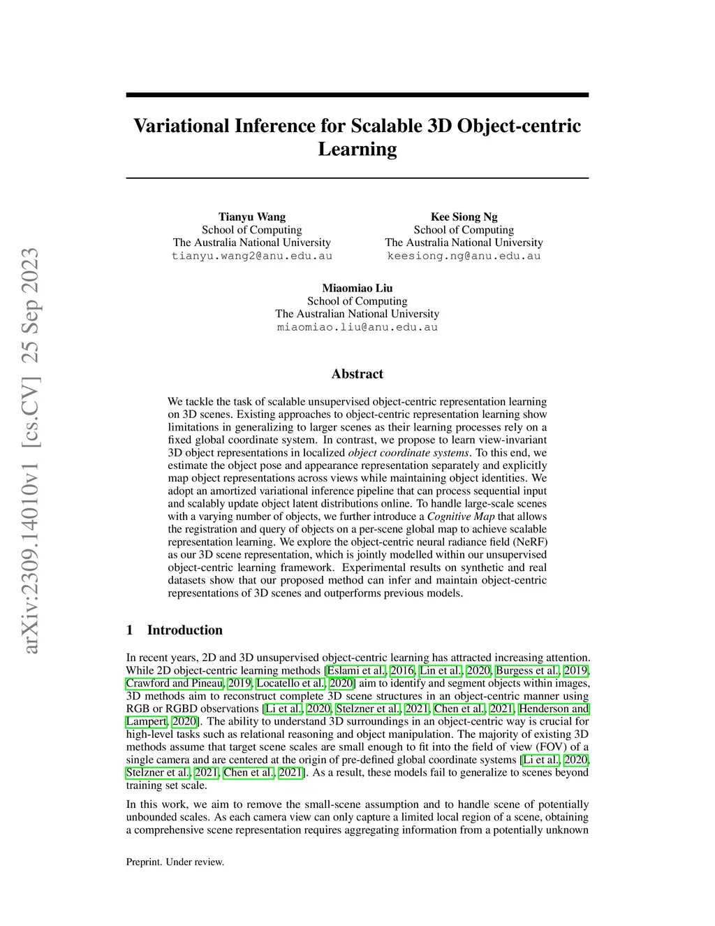 We tackle the task of scalable unsupervised object-centric representation learning on 3D scenes. Existing approaches to object-centric representation learning show limitations in generalizing to larger scenes as their learning processes rely on a fixed global coordinate system. In contrast, we propose to learn view-invariant 3D object representations in localized object coordinate systems. To this end, we estimate the object pose and appearance representation separately and explicitly map object representations across views while maintaining object identities. We adopt an amortized variational inference pipeline that can process sequential input and scalably update object latent distributions online. To handle large-scale scenes with a varying number of objects, we further introduce a Cognitive Map that allows the registration and query of objects on a per-scene global map to achieve scalable representation learning. We explore the object-centric neural radiance field (NeRF) as our 3D scene representation, which is jointly modeled within our unsupervised object-centric learning framework. Experimental results on synthetic and real datasets show that our proposed method can infer and maintain object-centric representations of 3D scenes and outperforms previous models.