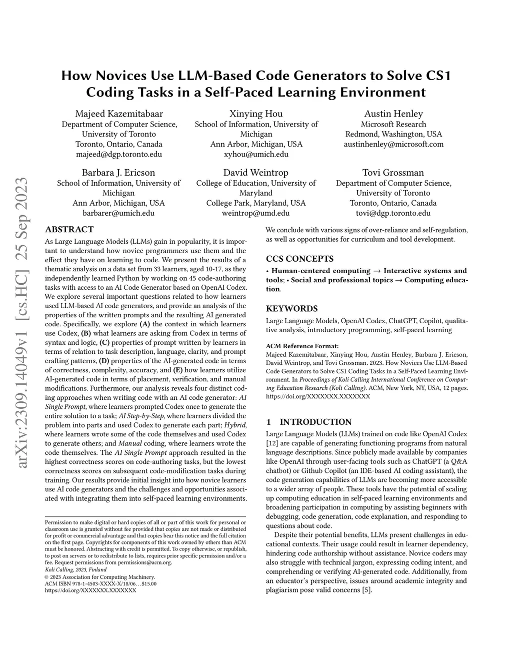 As Large Language Models (LLMs) gain in popularity, it is important to understand how novice programmers use them. We present a thematic analysis of 33 learners, aged 10-17, independently learning Python through 45 code-authoring tasks using Codex, an LLM-based code generator. We explore several questions related to how learners used these code generators and provide an analysis of the properties of the written prompts and the generated code. Specifically, we explore (A) the context in which learners use Codex, (B) what learners are asking from Codex, (C) properties of their prompts in terms of relation to task description, language, and clarity, and prompt crafting patterns, (D) the correctness, complexity, and accuracy of the AI-generated code, and (E) how learners utilize AI-generated code in terms of placement, verification, and manual modifications. Furthermore, our analysis reveals four distinct coding approaches when writing code with an AI code generator: AI Single Prompt, where learners prompted Codex once to generate the entire solution to a task; AI Step-by-Step, where learners divided the problem into parts and used Codex to generate each part; Hybrid, where learners wrote some of the code themselves and used Codex to generate others; and Manual coding, where learners wrote the code themselves. The AI Single Prompt approach resulted in the highest correctness scores on code-authoring tasks, but the lowest correctness scores on subsequent code-modification tasks during training. Our results provide initial insight into how novice learners use AI code generators and the challenges and opportunities associated with integrating them into self-paced learning environments. We conclude with various signs of over-reliance and self-regulation, as well as opportunities for curriculum and tool development.