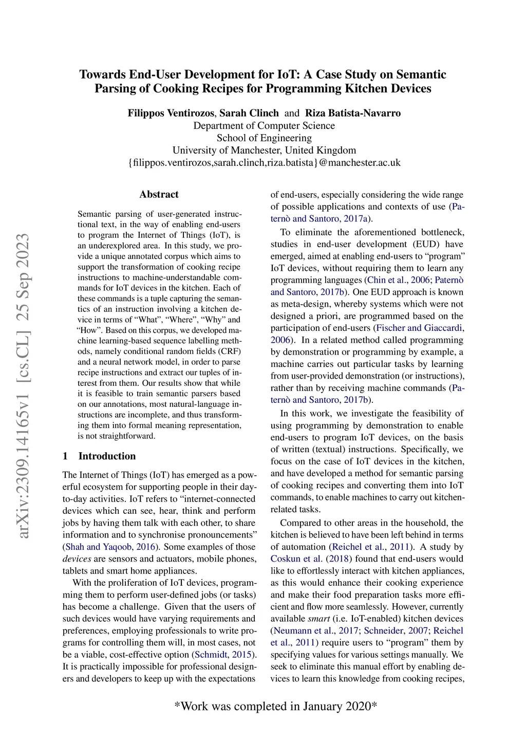 Semantic parsing of user-generated instructional text, in the way of enabling end-users to program the Internet of Things (IoT), is an underexplored area. In this study, we provide a unique annotated corpus which aims to support the transformation of cooking recipe instructions to machine-understandable commands for IoT devices in the kitchen. Each of these commands is a tuple capturing the semantics of an instruction involving a kitchen device in terms of "What", "Where", "Why" and "How". Based on this corpus, we developed machine learning-based sequence labelling methods, namely conditional random fields (CRF) and a neural network model, in order to parse recipe instructions and extract our tuples of interest from them. Our results show that while it is feasible to train semantic parsers based on our annotations, most natural-language instructions are incomplete, and thus transforming them into formal meaning representation, is not straightforward.