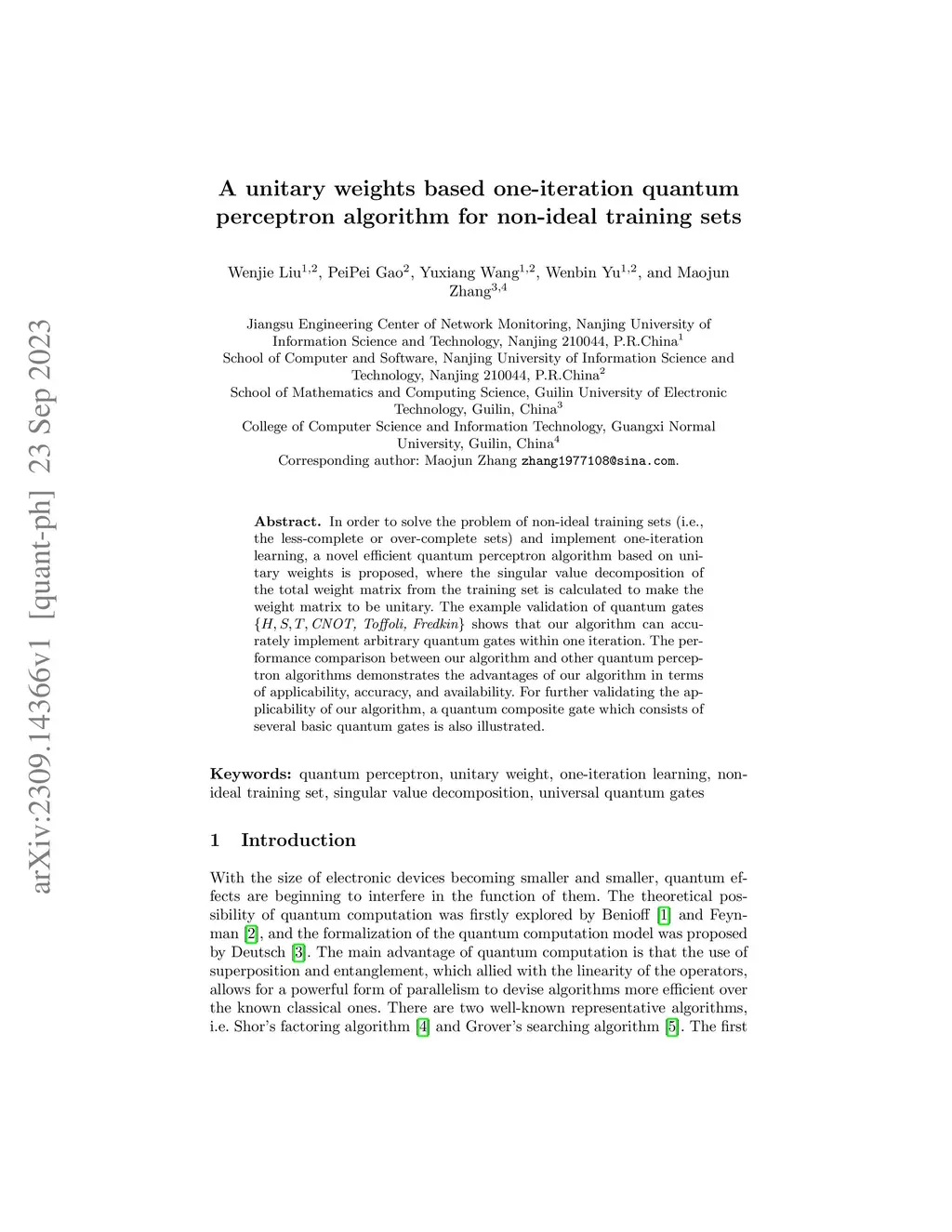 In order to solve the problem of non-ideal training sets (i.e., the less-complete or over-complete sets) and implement one-iteration learning, a novel efficient quantum perceptron algorithm based on unitary weights is proposed, where the singular value decomposition of the total weight matrix from the training set is calculated to make the weight matrix to be unitary. The example validation of quantum gates {H, S, T, CNOT, Toffoli, Fredkin} shows that our algorithm can accurately implement arbitrary quantum gates within one iteration. The performance comparison between our algorithm and other quantum perceptron algorithms demonstrates the advantages of our algorithm in terms of applicability, accuracy, and availability. For further validating the applicability of our algorithm, a quantum composite gate which consists of several basic quantum gates is also illustrated.