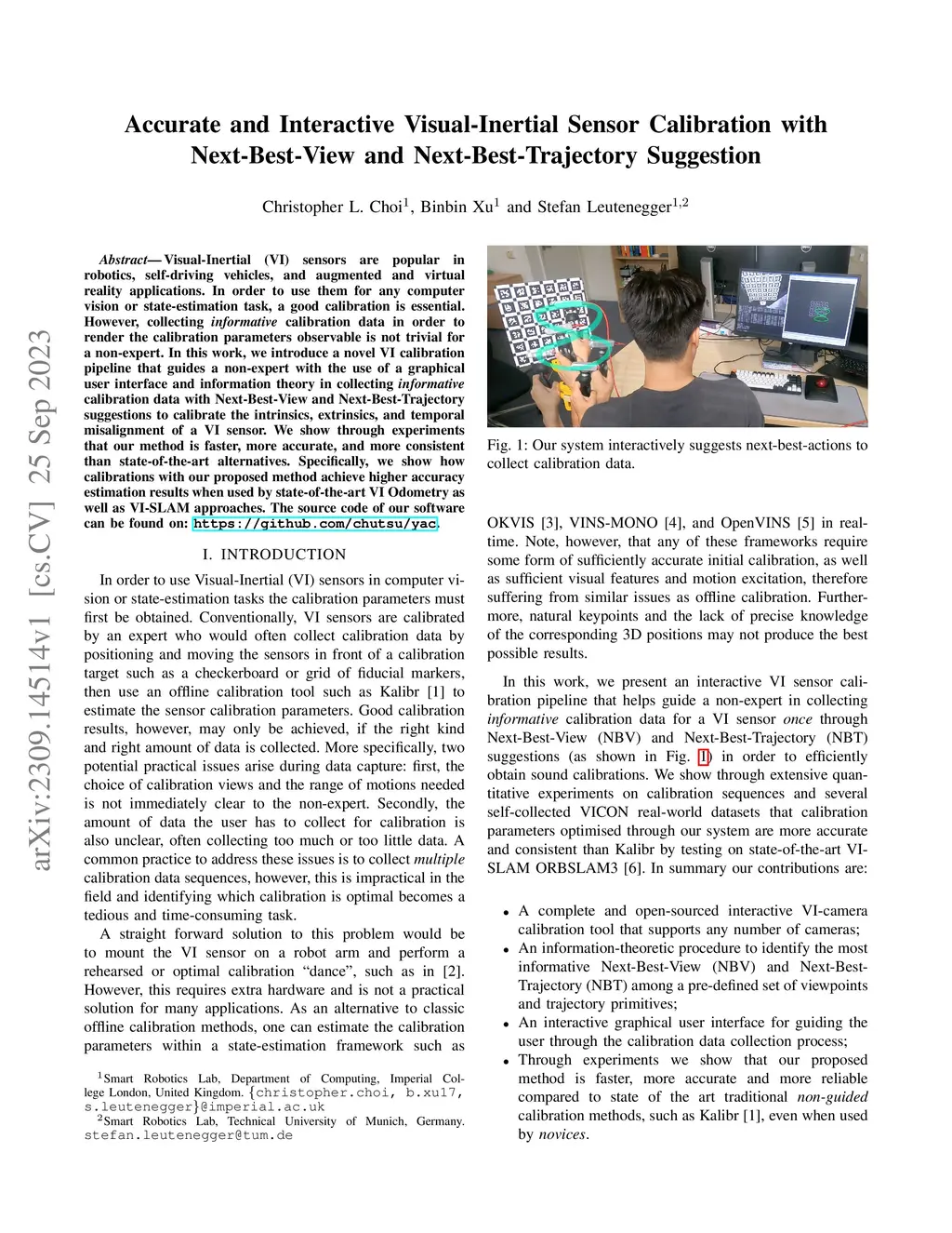 Visual-Inertial (VI) sensors are popular in robotics, self-driving vehicles, and augmented and virtual reality applications. In order to use them for any computer vision or state-estimation task, a good calibration is essential. However, collecting informative calibration data in order to render the calibration parameters observable is not trivial for a non-expert. In this work, we introduce a novel VI calibration pipeline that guides a non-expert with the use of a graphical user interface and information theory in collecting informative calibration data with Next-Best-View and Next-Best-Trajectory suggestions to calibrate the intrinsics, extrinsics, and temporal misalignment of a VI sensor. We show through experiments that our method is faster, more accurate, and more consistent than state-of-the-art alternatives. Specifically, we show how calibrations with our proposed method achieve higher accuracy estimation results when used by state-of-the-art VI Odometry as well as VI-SLAM approaches. The source code of our software can be found on: https://github.com/chutsu/yac.