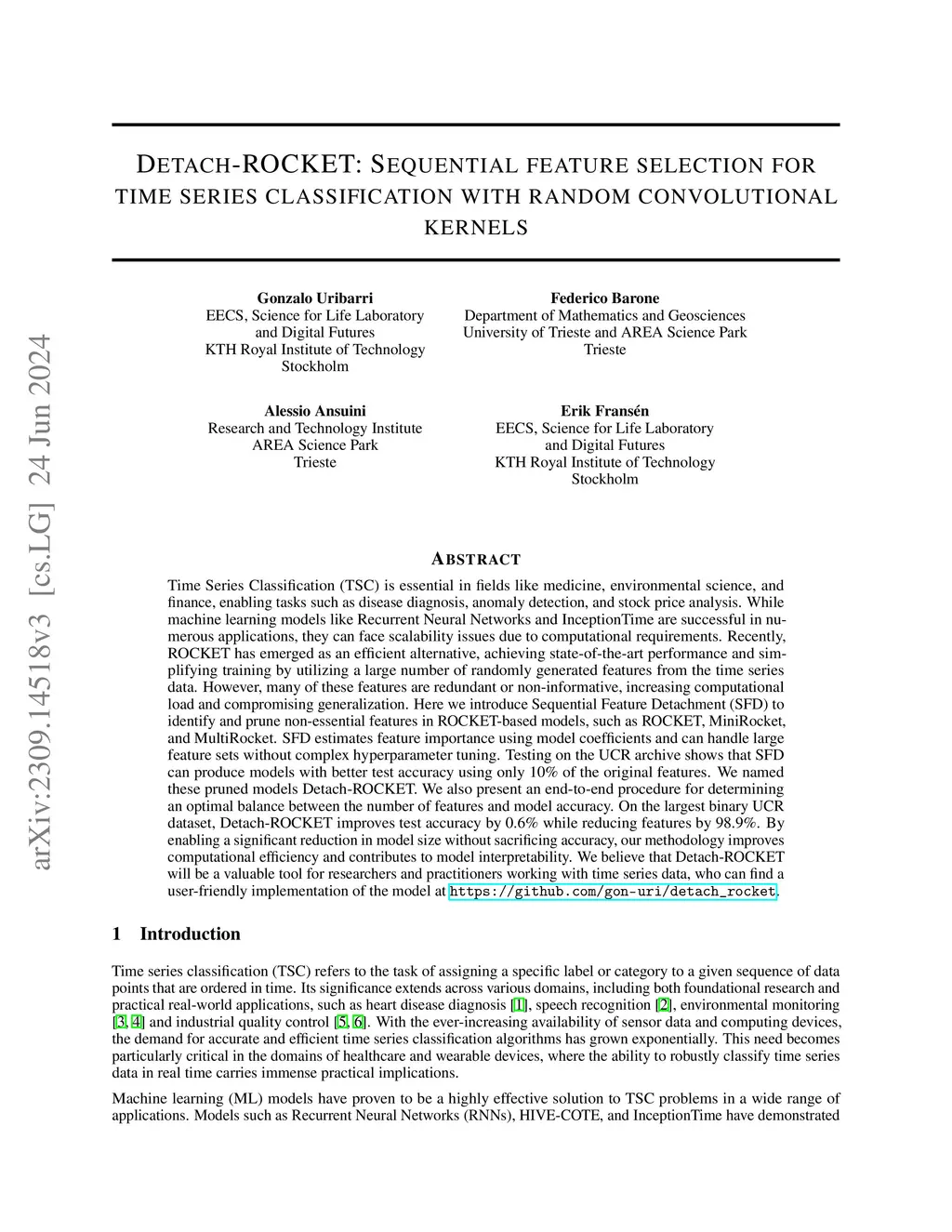 Time Series Classification (TSC) is essential in fields like medicine, environmental science, and finance, enabling tasks such as disease diagnosis, anomaly detection, and stock price analysis. While machine learning models like Recurrent Neural Networks and InceptionTime are successful in numerous applications, they can face scalability issues due to computational requirements. Recently, ROCKET has emerged as an efficient alternative, achieving state-of-the-art performance and simplifying training by utilizing a large number of randomly generated features from the time series data. However, many of these features are redundant or non-informative, increasing computational load and compromising generalization. Here we introduce Sequential Feature Detachment (SFD) to identify and prune non-essential features in ROCKET-based models, such as ROCKET, MiniRocket, and MultiRocket. SFD estimates feature importance using model coefficients and can handle large feature sets without complex hyperparameter tuning. Testing on the UCR archive shows that SFD can produce models with better test accuracy using only 10\% of the original features. We named these pruned models Detach-ROCKET. We also present an end-to-end procedure for determining an optimal balance between the number of features and model accuracy. On the largest binary UCR dataset, Detach-ROCKET improves test accuracy by 0.6\% while reducing features by 98.9\%. By enabling a significant reduction in model size without sacrificing accuracy, our methodology improves computational efficiency and contributes to model interpretability. We believe that Detach-ROCKET will be a valuable tool for researchers and practitioners working with time series data, who can find a user-friendly implementation of the model at \url{https://github.com/gon-uri/detach_rocket}.