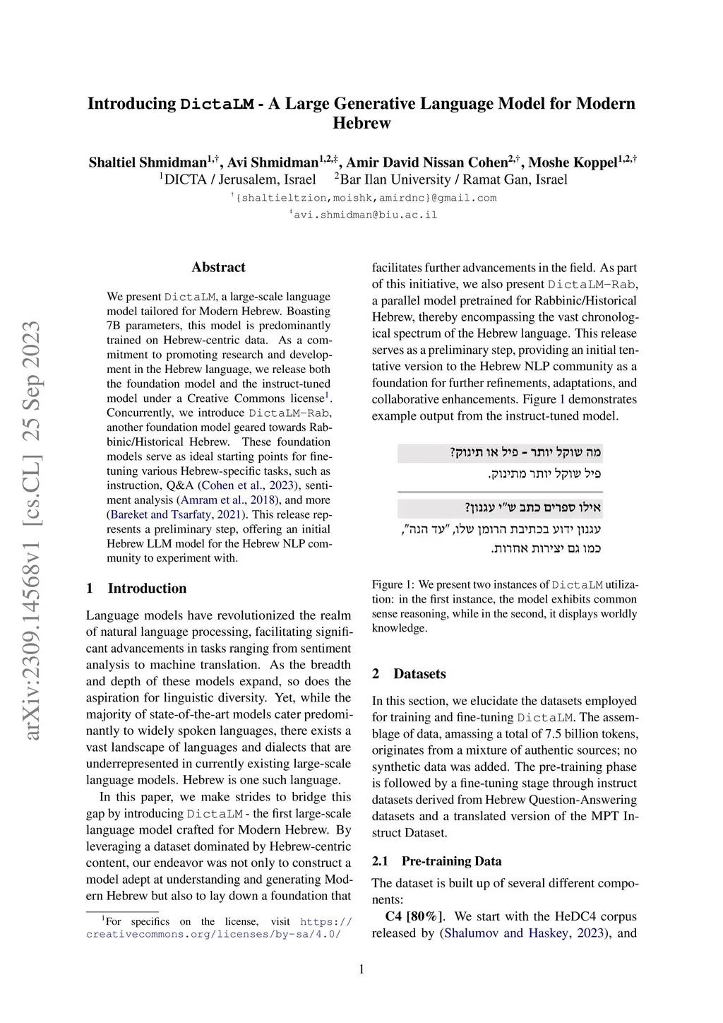 We present DictaLM, a large-scale language model tailored for Modern Hebrew. Boasting 7B parameters, this model is predominantly trained on Hebrew-centric data. As a commitment to promoting research and development in the Hebrew language, we release both the foundation model and the instruct-tuned model under a Creative Commons license. Concurrently, we introduce DictaLM-Rab, another foundation model geared towards Rabbinic/Historical Hebrew. These foundation models serve as ideal starting points for fine-tuning various Hebrew-specific tasks, such as instruction, Q&A, sentiment analysis, and more. This release represents a preliminary step, offering an initial Hebrew LLM model for the Hebrew NLP community to experiment with.