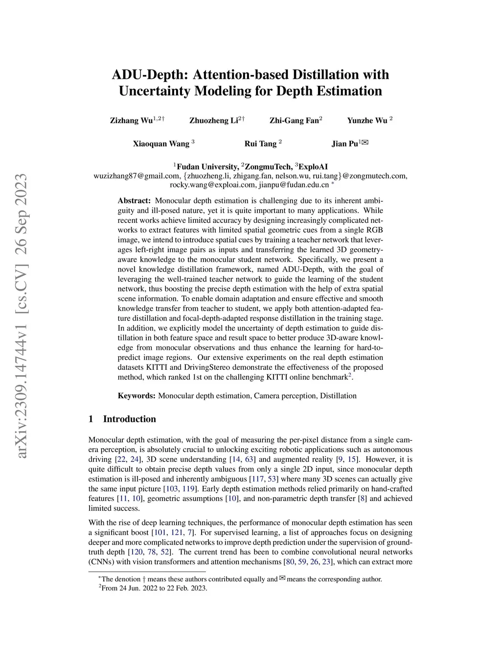 Monocular depth estimation is challenging due to its inherent ambiguity and ill-posed nature, yet it is quite important to many applications. While recent works achieve limited accuracy by designing increasingly complicated networks to extract features with limited spatial geometric cues from a single RGB image, we intend to introduce spatial cues by training a teacher network that leverages left-right image pairs as inputs and transferring the learned 3D geometry-aware knowledge to the monocular student network. Specifically, we present a novel knowledge distillation framework, named ADU-Depth, with the goal of leveraging the well-trained teacher network to guide the learning of the student network, thus boosting the precise depth estimation with the help of extra spatial scene information. To enable domain adaptation and ensure effective and smooth knowledge transfer from teacher to student, we apply both attention-adapted feature distillation and focal-depth-adapted response distillation in the training stage. In addition, we explicitly model the uncertainty of depth estimation to guide distillation in both feature space and result space to better produce 3D-aware knowledge from monocular observations and thus enhance the learning for hard-to-predict image regions. Our extensive experiments on the real depth estimation datasets KITTI and DrivingStereo demonstrate the effectiveness of the proposed method, which ranked 1st on the challenging KITTI online benchmark.