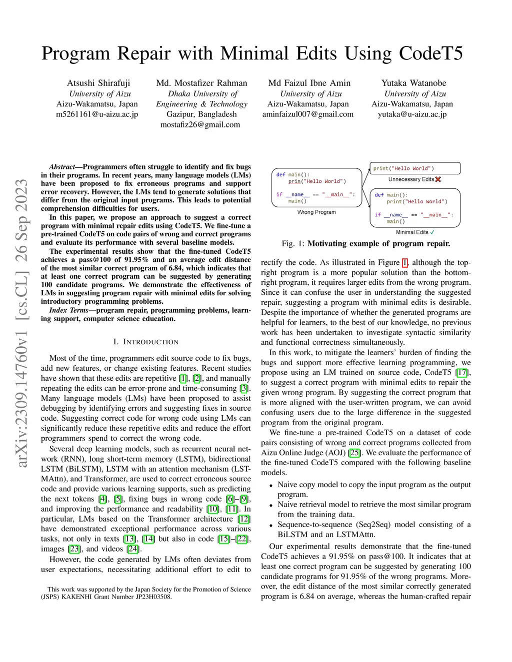 Programmers often struggle to identify and fix bugs in their programs. In recent years, many language models (LMs) have been proposed to fix erroneous programs and support error recovery. However, the LMs tend to generate solutions that differ from the original input programs. This leads to potential comprehension difficulties for users. In this paper, we propose an approach to suggest a correct program with minimal repair edits using CodeT5. We fine-tune a pre-trained CodeT5 on code pairs of wrong and correct programs and evaluate its performance with several baseline models. The experimental results show that the fine-tuned CodeT5 achieves a pass@100 of 91.95% and an average edit distance of the most similar correct program of 6.84, which indicates that at least one correct program can be suggested by generating 100 candidate programs. We demonstrate the effectiveness of LMs in suggesting program repair with minimal edits for solving introductory programming problems.