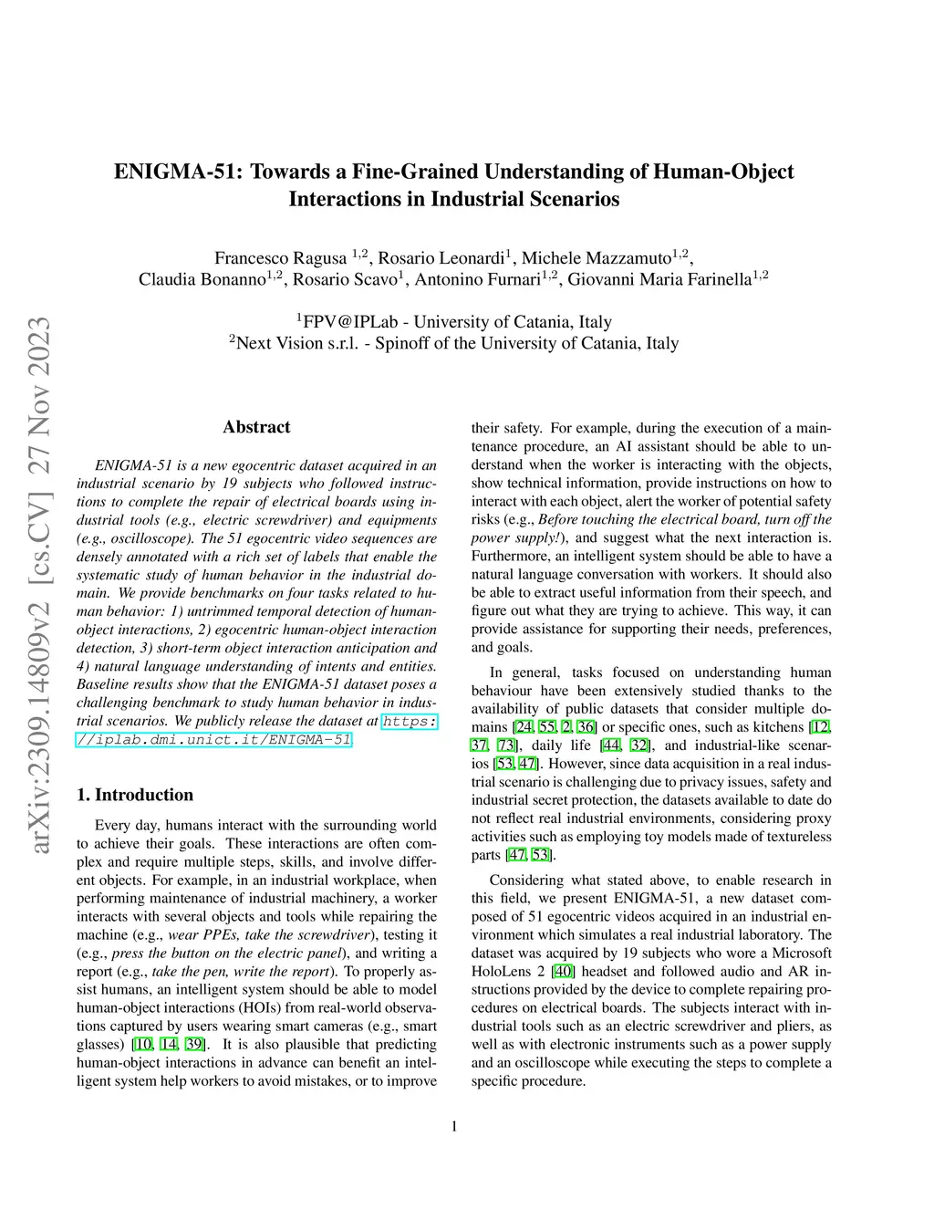 ENIGMA-51 is a new egocentric dataset acquired in an industrial scenario by 19 subjects who followed instructions to complete the repair of electrical boards using industrial tools (e.g., electric screwdriver) and equipments (e.g., oscilloscope). The 51 egocentric video sequences are densely annotated with a rich set of labels that enable the systematic study of human behavior in the industrial domain. We provide benchmarks on four tasks related to human behavior: 1) untrimmed temporal detection of human-object interactions, 2) egocentric human-object interaction detection, 3) short-term object interaction anticipation and 4) natural language understanding of intents and entities. Baseline results show that the ENIGMA-51 dataset poses a challenging benchmark to study human behavior in industrial scenarios. We publicly release the dataset at https://iplab.dmi.unict.it/ENIGMA-51.