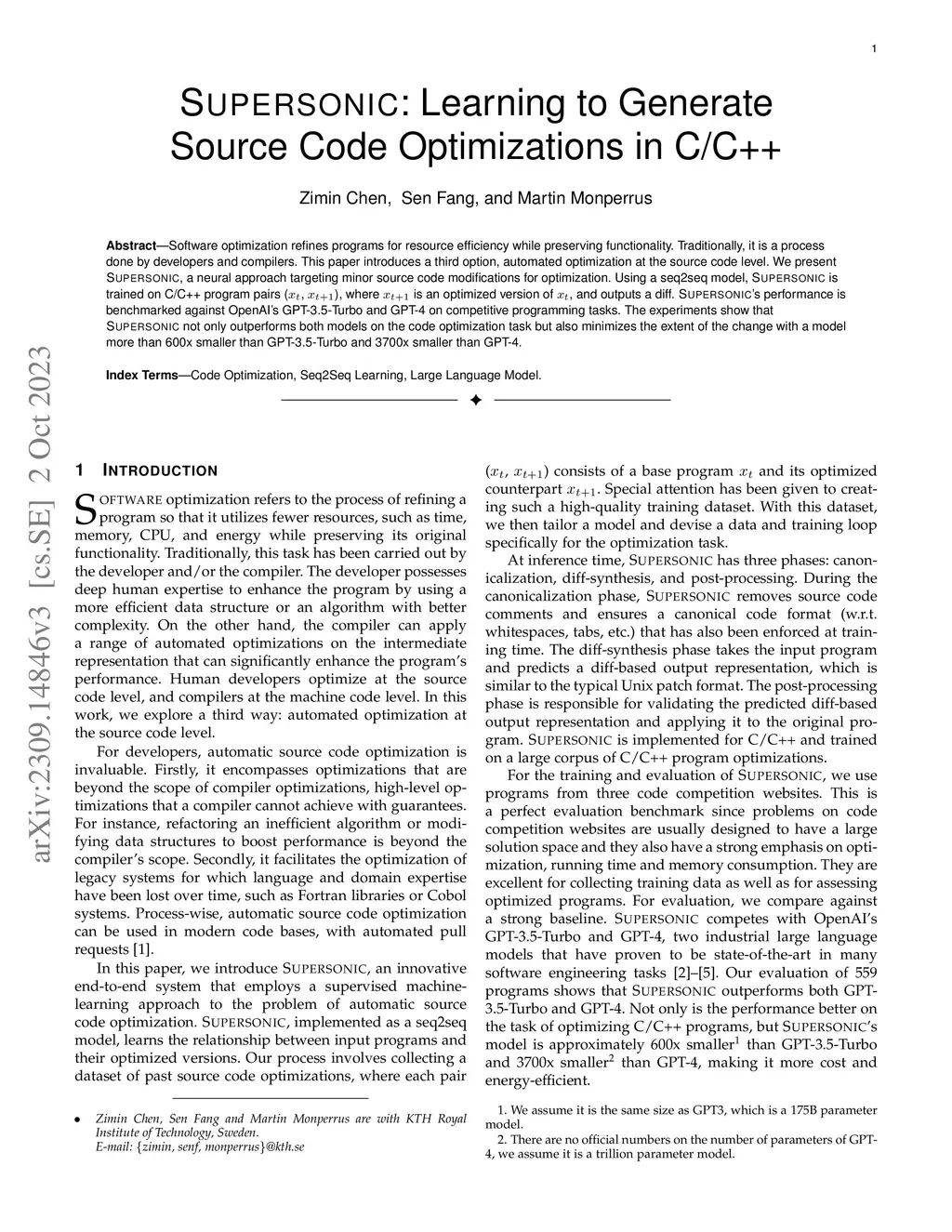 Software optimization refines programs for resource efficiency while preserving functionality. Traditionally, it is a process done by developers and compilers. This paper introduces a third option, automated optimization at the source code level. We present Supersonic, a neural approach targeting minor source code modifications for optimization. Using a seq2seq model, Supersonic is trained on C/C++ program pairs (, ), where is an optimized version of , and outputs a diff. Supersonic's performance is benchmarked against OpenAI's GPT-3.5-Turbo and GPT-4 on competitive programming tasks. The experiments show that Supersonic not only outperforms both models on the code optimization task but also minimizes the extent of the change with a model more than 600x smaller than GPT-3.5-Turbo and 3700x smaller than GPT-4.