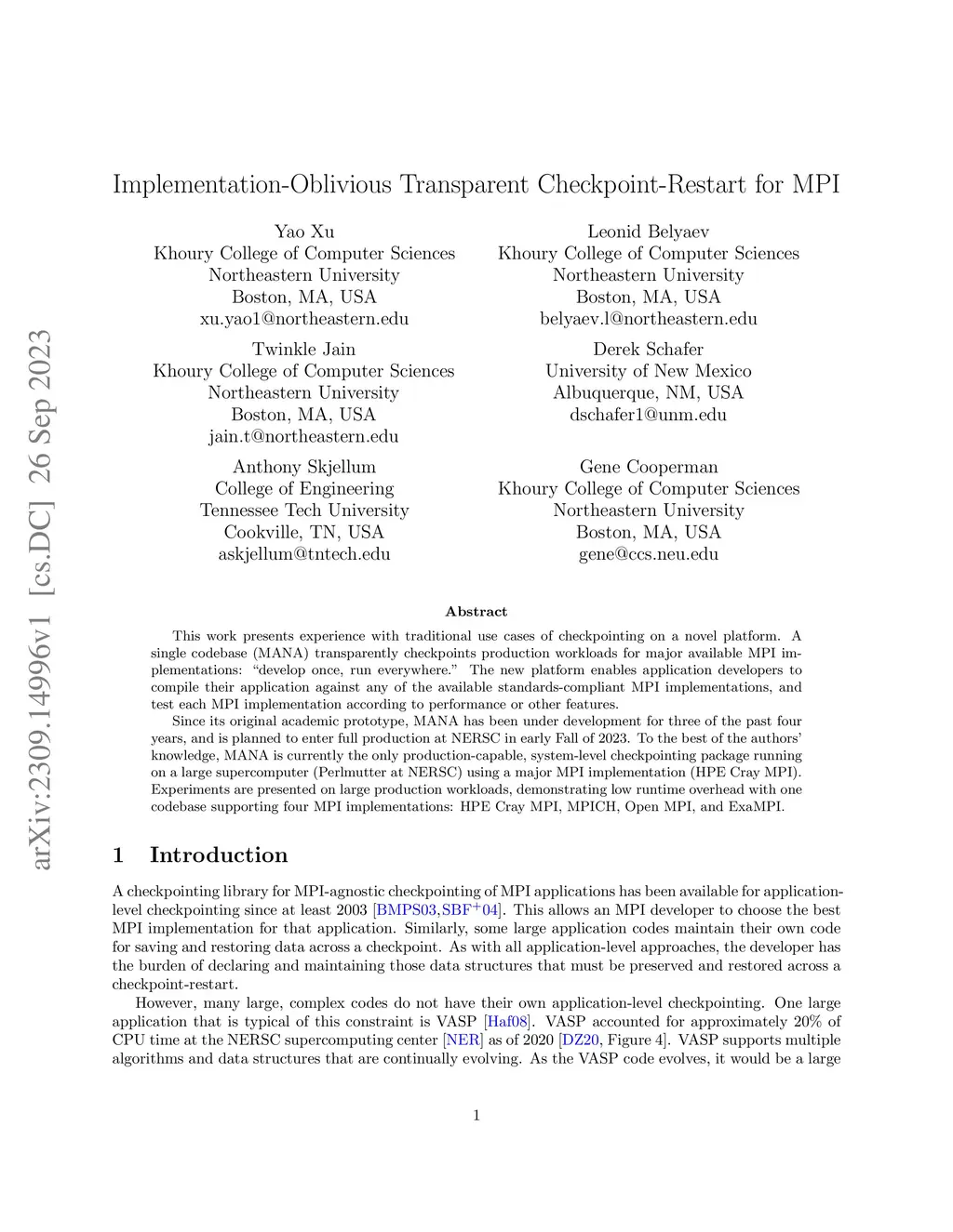 This work presents experience with traditional use cases of checkpointing on a novel platform. A single codebase (MANA) transparently checkpoints production workloads for major available MPI implementations: "develop once, run everywhere". The new platform enables application developers to compile their application against any of the available standards-compliant MPI implementations, and test each MPI implementation according to performance or other features.