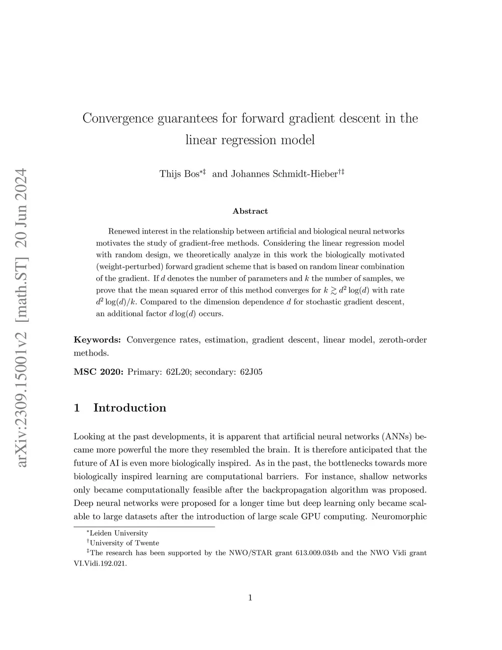Renewed interest in the relationship between artificial and biological neural networks motivates the study of gradient-free methods. Considering the linear regression model with random design, we theoretically analyze in this work the biologically motivated (weight-perturbed) forward gradient scheme that is based on random linear combination of the gradient. If d denotes the number of parameters and k the number of samples, we prove that the mean squared error of this method converges for with rate Compared to the dimension dependence d for stochastic gradient descent, an additional factor occurs.