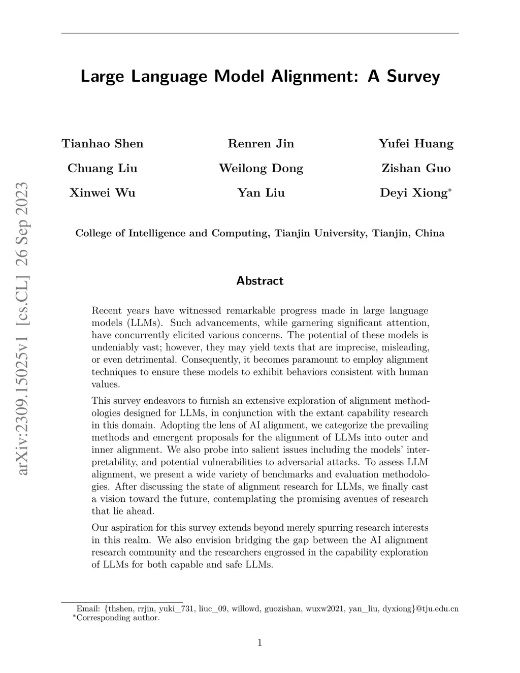 Recent years have witnessed remarkable progress made in large language models (LLMs). Such advancements, while garnering significant attention, have concurrently elicited various concerns. The potential of these models is undeniably vast; however, they may yield texts that are imprecise, misleading, or even detrimental. Consequently, it becomes paramount to employ alignment techniques to ensure these models to exhibit behaviors consistent with human values. This survey endeavors to furnish an extensive exploration of alignment methodologies designed for LLMs, in conjunction with the extant capability research in this domain. Adopting the lens of AI alignment, we categorize the prevailing methods and emergent proposals for the alignment of LLMs into outer and inner alignment. We also probe into salient issues including the models' interpretability, and potential vulnerabilities to adversarial attacks. To assess LLM alignment, we present a wide variety of benchmarks and evaluation methodologies. After discussing the state of alignment research for LLMs, we finally cast a vision toward the future, contemplating the promising avenues of research that lie ahead. Our aspiration for this survey extends beyond merely spurring research interests in this realm. We also envision bridging the gap between the AI alignment research community and the researchers engrossed in the capability exploration of LLMs for both capable and safe LLMs.