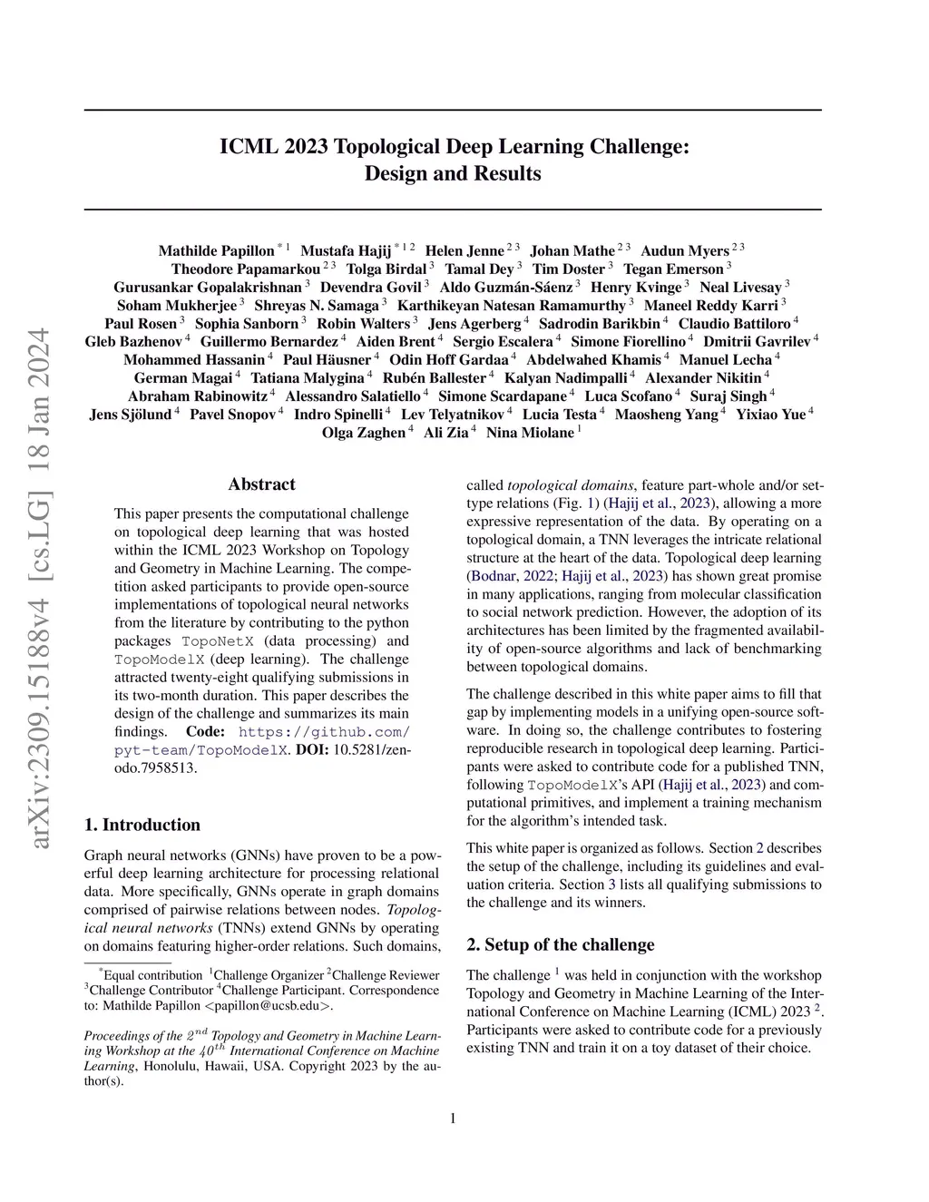 This paper presents the computational challenge on topological deep learning that was hosted within the ICML 2023 Workshop on Topology and Geometry in Machine Learning. The competition asked participants to provide open-source implementations of topological neural networks from the literature by contributing to the python packages TopoNetX (data processing) and TopoModelX (deep learning). The challenge attracted twenty-eight qualifying submissions in its two-month duration. This paper describes the design of the challenge and summarizes its main findings.
