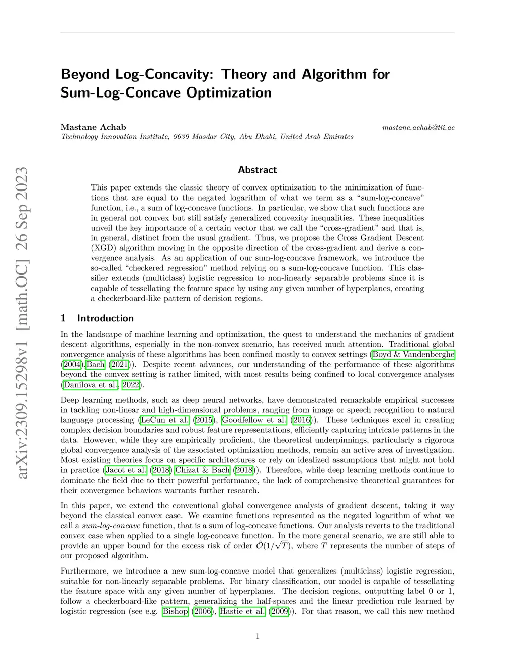 This paper extends the classic theory of convex optimization to the minimization of functions that are equal to the negated logarithm of what we term as a sum-log-concave function, i.e., a sum of log-concave functions. In particular, we show that such functions are in general not convex but still satisfy generalized convexity inequalities. These inequalities unveil the key importance of a certain vector that we call the cross-gradient and that is, in general, distinct from the usual gradient. Thus, we propose the Cross Gradient Descent (XGD) algorithm moving in the opposite direction of the cross-gradient and derive a convergence analysis. As an application of our sum-log-concave framework, we introduce the so-called checkered regression method relying on a sum-log-concave function. This classifier extends (multiclass) logistic regression to non-linearly separable problems since it is capable of tessellating the feature space by using any given number of hyperplanes, creating a checkerboard-like pattern of decision regions.