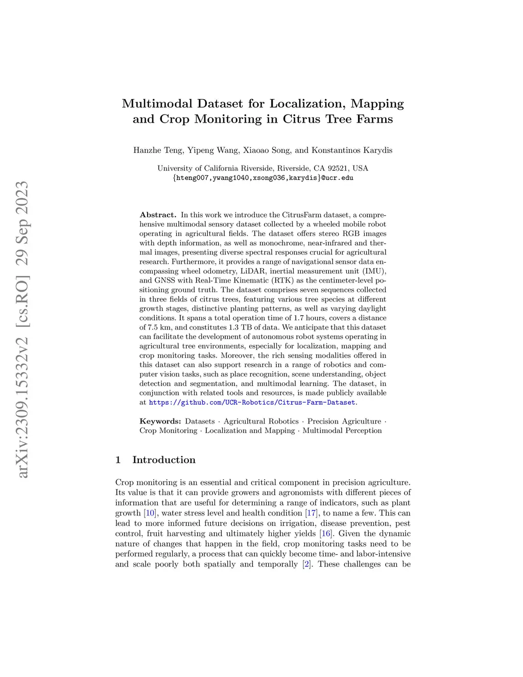 Multimodal Dataset for Localization, Mapping and Crop Monitoring in