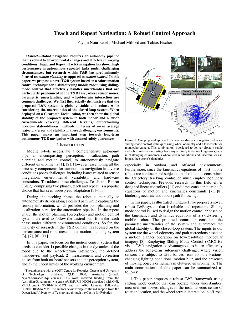 Robot navigation requires an autonomy pipeline that is robust to environmental changes and effective in varying conditions. Teach and Repeat (T&R) navigation has shown high performance in autonomous repeated tasks under challenging circumstances, but research within T&R has predominantly focused on motion planning as opposed to motion control. In this paper, we propose a novel T&R system based on a robust motion control technique for a skid-steering mobile robot using sliding-mode control that effectively handles uncertainties that are particularly pronounced in the T&R task, where sensor noises, parametric uncertainties, and wheel-terrain interaction are common challenges. We first theoretically demonstrate that the proposed T&R system is globally stable and robust while considering the uncertainties of the closed-loop system. When deployed on a Clearpath Jackal robot, we then show the global stability of the proposed system in both indoor and outdoor environments covering different terrains, outperforming previous state-of-the-art methods in terms of mean average trajectory error and stability in these challenging environments. This paper makes an important step towards long-term autonomous T&R navigation with ensured safety guarantees.
