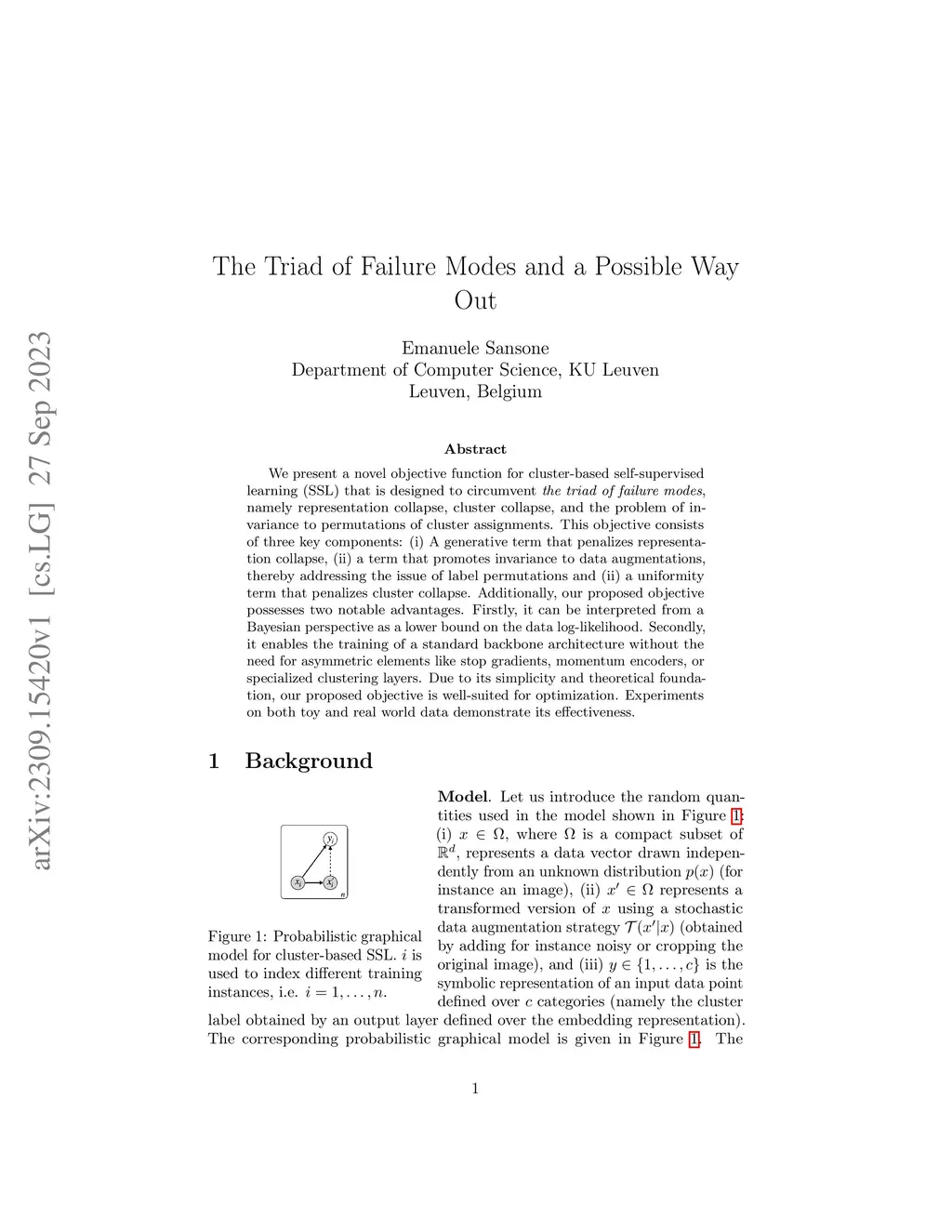 We present a novel objective function for cluster-based self-supervised learning (SSL) that is designed to circumvent the triad of failure modes, namely representation collapse, cluster collapse, and the problem of invariance to permutations of cluster assignments. This objective consists of three key components: (i) A generative term that penalizes representation collapse, (ii) a term that promotes invariance to data augmentations, thereby addressing the issue of label permutations and (ii) a uniformity term that penalizes cluster collapse. Additionally, our proposed objective possesses two notable advantages. Firstly, it can be interpreted from a Bayesian perspective as a lower bound on the data log-likelihood. Secondly, it enables the training of a standard backbone architecture without the need for asymmetric elements like stop gradients, momentum encoders, or specialized clustering layers. Due to its simplicity and theoretical foundation, our proposed objective is well-suited for optimization. Experiments on both toy and real world data demonstrate its effectiveness