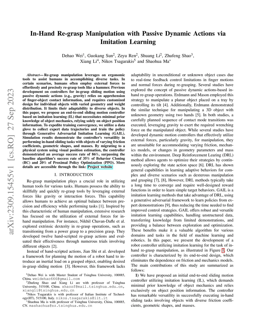 Re-grasp manipulation leverages on ergonomic tools to assist humans in accomplishing diverse tasks. In certain scenarios, humans often employ external forces to effortlessly and precisely re-grasp tools like a hammer. Previous development on controllers for in-grasp sliding motion using passive dynamic actions (e.g.,gravity) relies on apprehension of finger-object contact information, and requires customized design for individual objects with varied geometry and weight distribution. It limits their adaptability to diverse objects. In this paper, we propose an end-to-end sliding motion controller based on imitation learning (IL) that necessitates minimal prior knowledge of object mechanics, relying solely on object position information. To expedite training convergence, we utilize a data glove to collect expert data trajectories and train the policy through Generative Adversarial Imitation Learning (GAIL). Simulation results demonstrate the controller's versatility in performing in-hand sliding tasks with objects of varying friction coefficients, geometric shapes, and masses. By migrating to a physical system using visual position estimation, the controller demonstrated an average success rate of 86%, surpassing the baseline algorithm's success rate of 35% of Behavior Cloning(BC) and 20% of Proximal Policy Optimization (PPO).