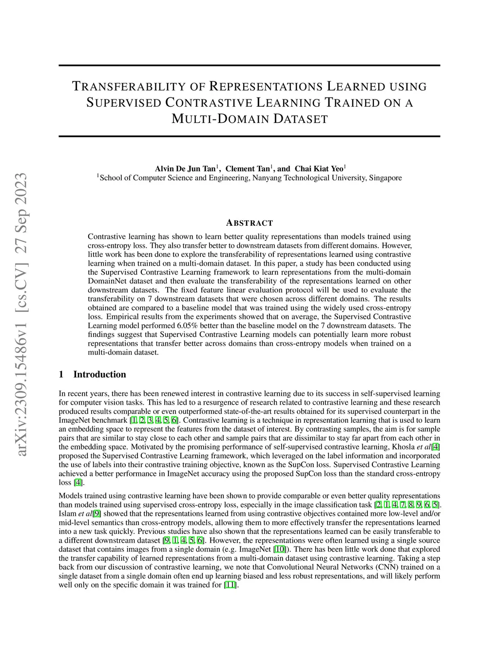 Contrastive learning has shown to learn better quality representations than models trained using cross-entropy loss. They also transfer better to downstream datasets from different domains. However, little work has been done to explore the transferability of representations learned using contrastive learning when trained on a multi-domain dataset. In this paper, a study has been conducted using the Supervised Contrastive Learning framework to learn representations from the multi-domain DomainNet dataset and then evaluate the transferability of the representations learned on other downstream datasets. The fixed feature linear evaluation protocol will be used to evaluate the transferability on 7 downstream datasets that were chosen across different domains. The results obtained are compared to a baseline model that was trained using the widely used cross-entropy loss. Empirical results from the experiments showed that on average, the Supervised Contrastive Learning model performed 6.05% better than the baseline model on the 7 downstream datasets. The findings suggest that Supervised Contrastive Learning models can potentially learn more robust representations that transfer better across domains than cross-entropy models when trained on a multi-domain dataset.