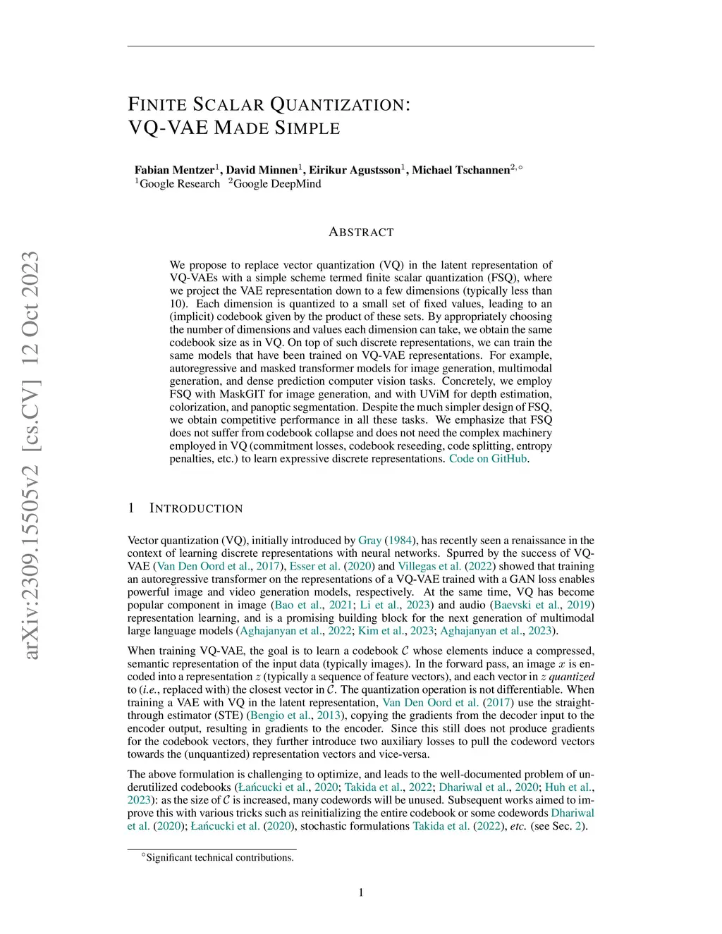 We propose to replace vector quantization (VQ) in the latent representation of VQ-VAEs with a simple scheme termed finite scalar quantization (FSQ), where we project the VAE representation down to a few dimensions (typically less than 10). Each dimension is quantized to a small set of fixed values, leading to an (implicit) codebook given by the product of these sets. By appropriately choosing the number of dimensions and values each dimension can take, we obtain the same codebook size as in VQ. On top of such discrete representations, we can train the same models that have been trained on VQ-VAE representations. For example, autoregressive and masked transformer models for image generation, multimodal generation, and dense prediction computer vision tasks. Concretely, we employ FSQ with MaskGIT for image generation, and with UViM for depth estimation, colorization, and panoptic segmentation. Despite the much simpler design of FSQ, we obtain competitive performance in all these tasks. We emphasize that FSQ does not suffer from codebook collapse and does not need the complex machinery employed in VQ (commitment losses, codebook reseeding, code splitting, entropy penalties, etc.) to learn expressive discrete representations.