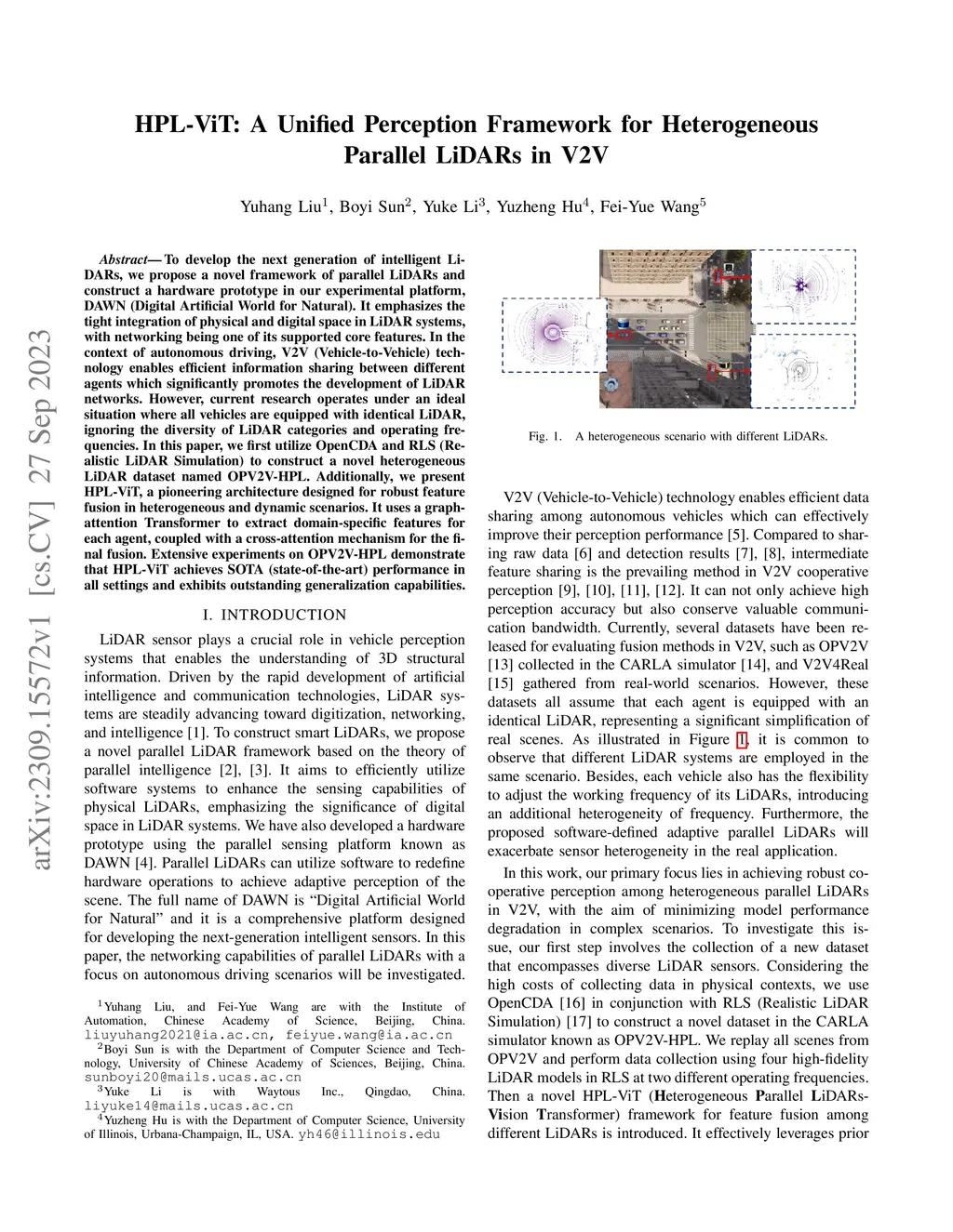 To develop the next generation of intelligent LiDARs, we propose a novel framework of parallel LiDARs and construct a hardware prototype in our experimental platform, DAWN (Digital Artificial World for Natural). It emphasizes the tight integration of physical and digital space in LiDAR systems, with networking being one of its supported core features. In the context of autonomous driving, V2V (Vehicle-to-Vehicle) technology enables efficient information sharing between different agents which significantly promotes the development of LiDAR networks. However, current research operates under an ideal situation where all vehicles are equipped with identical LiDAR, ignoring the diversity of LiDAR categories and operating frequencies. In this paper, we first utilize OpenCDA and RLS (Realistic LiDAR Simulation) to construct a novel heterogeneous LiDAR dataset named OPV2V-HPL. Additionally, we present HPL-ViT, a pioneering architecture designed for robust feature fusion in heterogeneous and dynamic scenarios. It uses a graph-attention Transformer to extract domain-specific features for each agent, coupled with a cross-attention mechanism for the final fusion. Extensive experiments on OPV2V-HPL demonstrate that HPL-ViT achieves SOTA (state-of-the-art) performance in all settings and exhibits outstanding generalization capabilities.