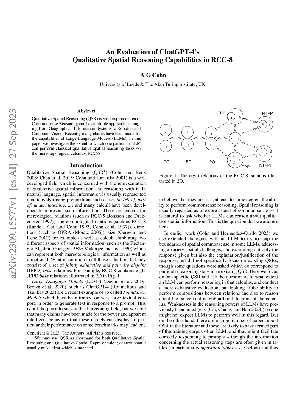 Qualitative Spatial Reasoning (QSR) is well explored area of Commonsense Reasoning and has multiple applications ranging from Geographical Information Systems to Robotics and Computer Vision. Recently many claims have been made for the capabilities of Large Language Models (LLMs). In this paper we investigate the extent to which one particular LLM can perform classical qualitative spatial reasoning tasks on the mereotopological calculus, RCC-8.