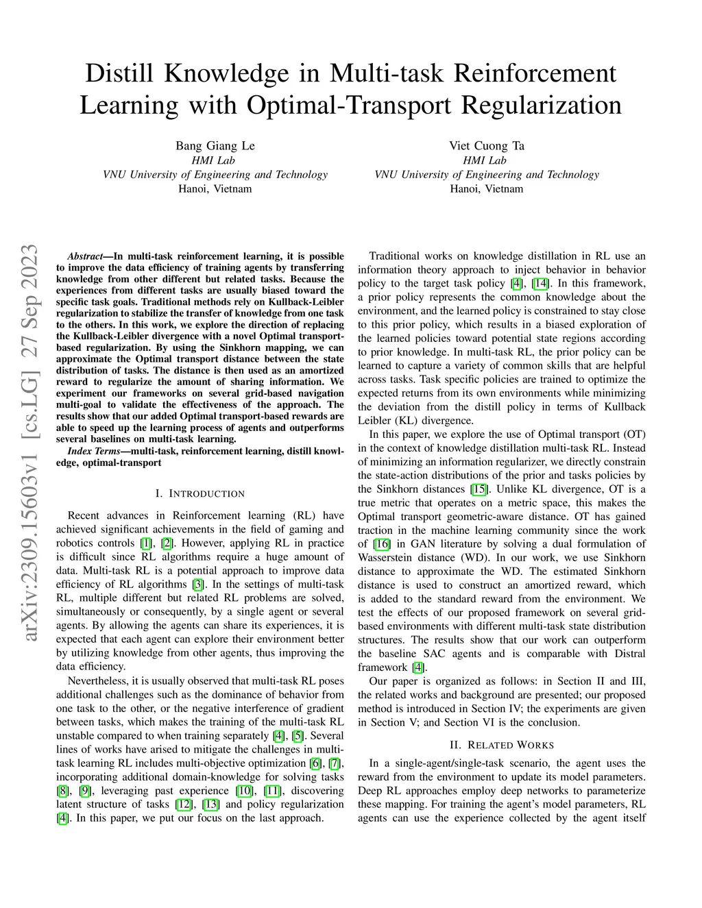 In multi-task reinforcement learning, it is possible to improve the data efficiency of training agents by transferring knowledge from other different but related tasks. Because the experiences from different tasks are usually biased toward the specific task goals. Traditional methods rely on Kullback-Leibler regularization to stabilize the transfer of knowledge from one task to the others. In this work, we explore the direction of replacing the Kullback-Leibler divergence with a novel Optimal transport-based regularization. By using the Sinkhorn mapping, we can approximate the Optimal transport distance between the state distribution of tasks. The distance is then used as an amortized reward to regularize the amount of sharing information. We experiment our frameworks on several grid-based navigation multi-goal to validate the effectiveness of the approach. The results show that our added Optimal transport-based rewards are able to speed up the learning process of agents and outperforms several baselines on multi-task learning.