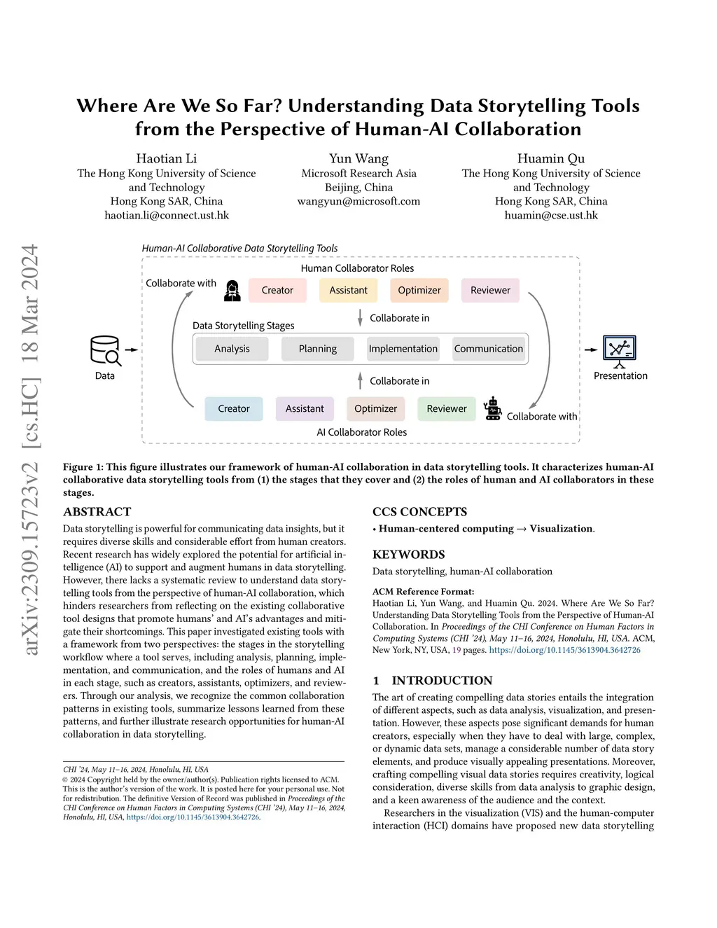 Data storytelling is powerful for communicating data insights, but it requires diverse skills and considerable effort from human creators. Recent research has widely explored the potential for artificial intelligence (AI) to support and augment humans in data storytelling. However, there lacks a systematic review to understand data storytelling tools from the perspective of human-AI collaboration, which hinders researchers from reflecting on the existing collaborative tool designs that promote humans' and AI's advantages and mitigate their shortcomings. This paper investigated existing tools with a framework from two perspectives: the stages in the storytelling workflow where a tool serves, including analysis, planning, implementation, and communication, and the roles of humans and AI in each stage, such as creators, assistants, optimizers, and reviewers. Through our analysis, we recognize the common collaboration patterns in existing tools, summarize lessons learned from these patterns, and further illustrate research opportunities for human-AI collaboration in data storytelling.