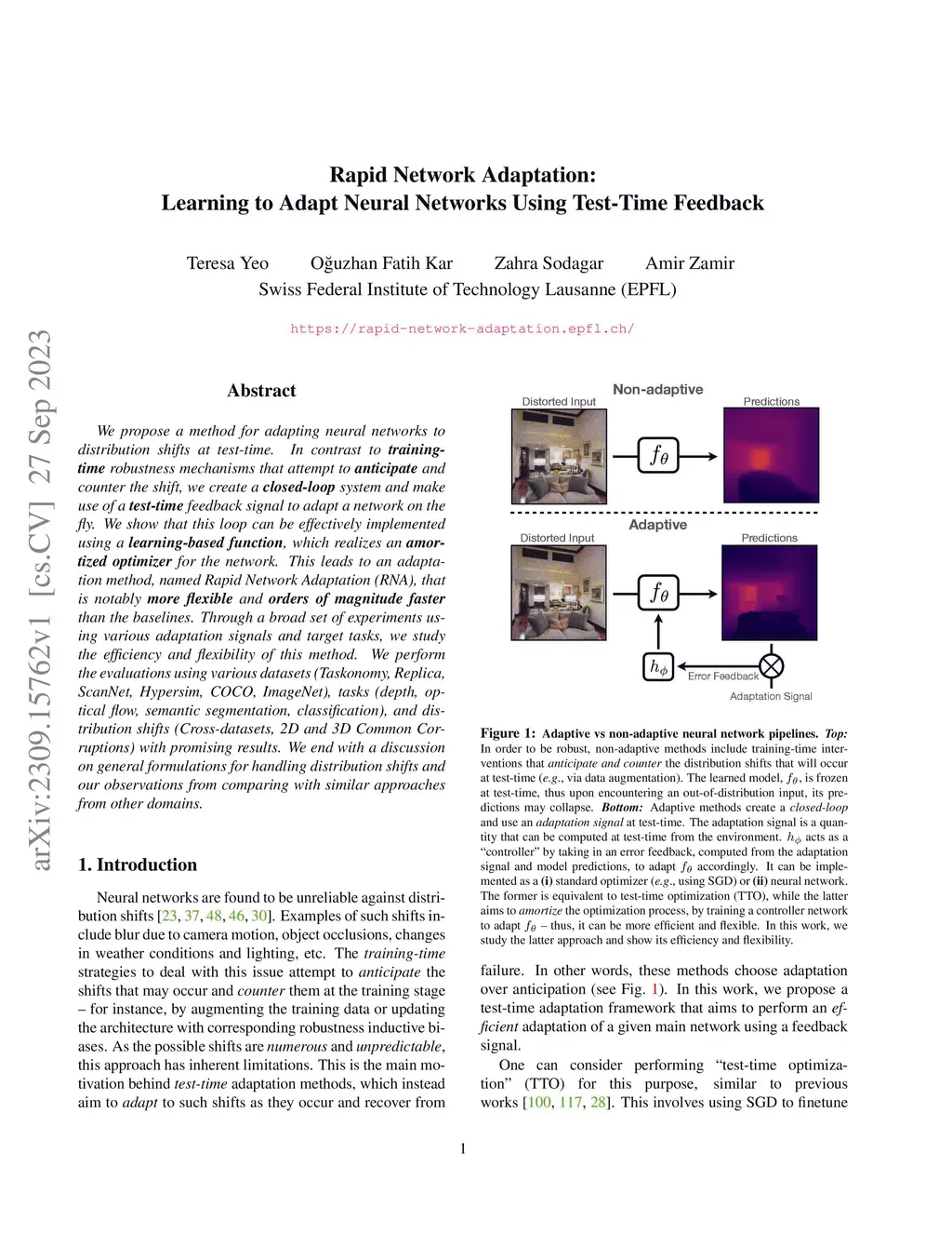 We propose a method for adapting neural networks to distribution shifts at test-time. In contrast to training-time robustness mechanisms that attempt to anticipate and counter the shift, we create a closed-loop system and make use of a test-time feedback signal to adapt a network on the fly. We show that this loop can be effectively implemented using a learning-based function, which realizes an amortized optimizer for the network. This leads to an adaptation method, named Rapid Network Adaptation (RNA), that is notably more flexible and orders of magnitude faster than the baselines. Through a broad set of experiments using various adaptation signals and target tasks, we study the efficiency and flexibility of this method. We perform the evaluations using various datasets (Taskonomy, Replica, ScanNet, Hypersim, COCO, ImageNet), tasks (depth, optical flow, semantic segmentation, classification), and distribution shifts (Cross-datasets, 2D and 3D Common Corruptions) with promising results. We end with a discussion on general formulations for handling distribution shifts and our observations from comparing with similar approaches from other domains.