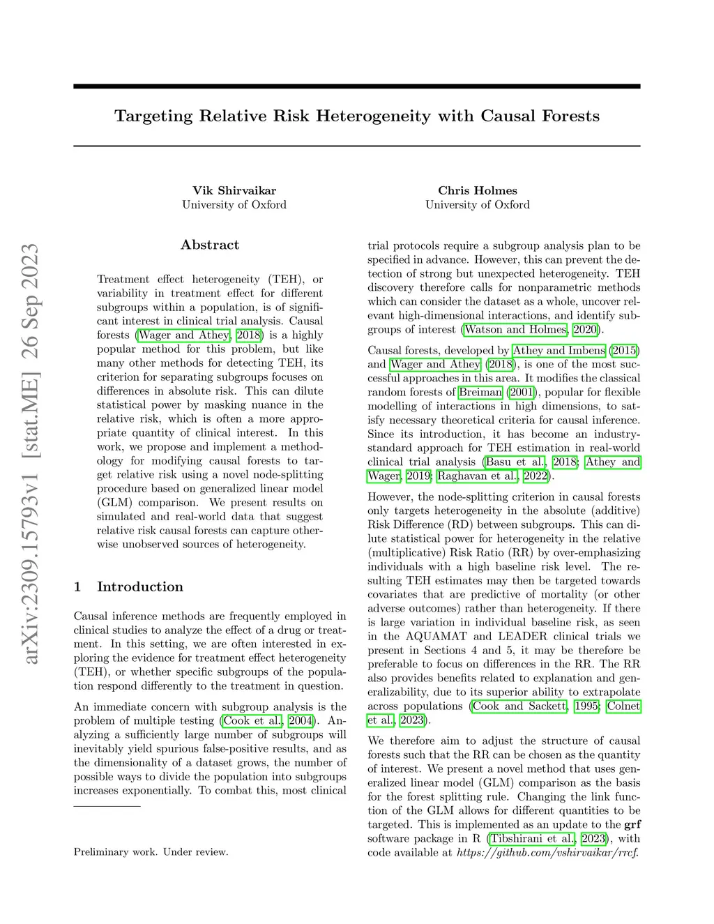 The estimation of heterogeneous treatment effects (HTE) across different subgroups in a population is of significant interest in clinical trial analysis. State-of-the-art HTE estimation methods, including causal forests (Wager and Athey, 2018), generally rely on recursive partitioning for non-parametric identification of relevant covariates and interactions. However, like many other methods in this area, causal forests partition subgroups based on differences in absolute risk. This can dilute statistical power by masking variability in the relative risk, which is often a more appropriate quantity of clinical interest. In this work, we propose and implement a methodology for modifying causal forests to target relative risk, using a novel node-splitting procedure based on exhaustive generalized linear model comparison. We present results that suggest relative risk causal forests can capture otherwise undetected sources of heterogeneity.