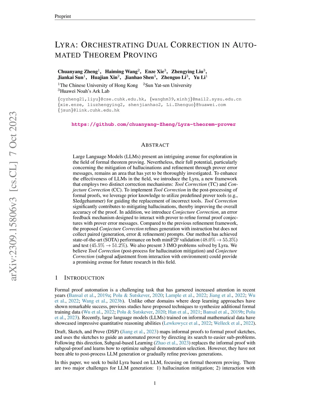 Large Language Models (LLMs) present an intriguing avenue for exploration in the field of formal theorem proving. Nevertheless, their full potential, particularly concerning the mitigation of hallucinations and refinement through prover error messages, remains an area that has yet to be thoroughly investigated. To enhance the effectiveness of LLMs in the field, we introduce the Lyra, a new framework that employs two distinct correction mechanisms: Tool Correction (TC) and Conjecture Correction (CC). To implement Tool Correction in the post-processing of formal proofs, we leverage prior knowledge to utilize predefined prover tools (e.g., Sledgehammer) for guiding the replacement of incorrect tools. Tool Correction significantly contributes to mitigating hallucinations, thereby improving the overall accuracy of the proof. In addition, we introduce Conjecture Correction, an error feedback mechanism designed to interact with prover to refine formal proof conjectures with prover error messages. Compared to the previous refinement framework, the proposed Conjecture Correction refines generation with instruction but does not collect paired (generation, error & refinement) prompts. Our method has achieved state-of-the-art (SOTA) performance on both miniF2F validation (48.0% -> 55.3%) and test (45.5% -> 51.2%). We also present 3 IMO problems solved by Lyra. We believe Tool Correction (post-process for hallucination mitigation) and Conjecture Correction (subgoal adjustment from interaction with environment) could provide a promising avenue for future research in this field.