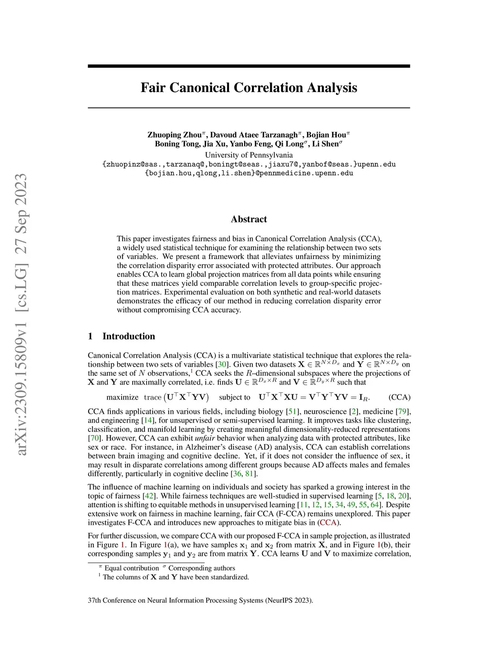 This paper investigates fairness and bias in Canonical Correlation Analysis (CCA), a widely used statistical technique for examining the relationship between two sets of variables. We present a framework that alleviates unfairness by minimizing the correlation disparity error associated with protected attributes. Our approach enables CCA to learn global projection matrices from all data points while ensuring that these matrices yield comparable correlation levels to group-specific projection matrices. Experimental evaluation on both synthetic and real-world datasets demonstrates the efficacy of our method in reducing correlation disparity error without compromising CCA accuracy.