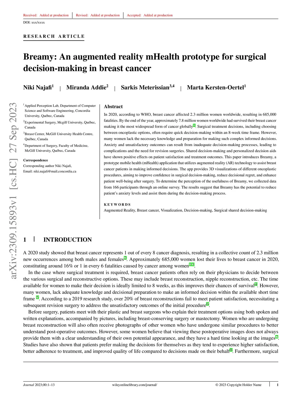 In 2020, according to WHO, breast cancer affected 2.3 million women worldwide, resulting in 685,000 fatalities. By the end of the year, approximately 7.8 million women worldwide had survived their breast cancer making it the most widespread form of cancer globally. Surgical treatment decisions, including choosing between oncoplastic options, often require quick decision-making within an 8-week time frame. However, many women lack the necessary knowledge and preparation for making such complex informed decisions. Anxiety and unsatisfactory outcomes can result from inadequate decision-making processes, leading to complications and the need for revision surgeries. Shared decision-making and personalized decision aids have shown positive effects on patient satisfaction and treatment outcomes. This paper introduces Breamy, a prototype mobile health (mHealth) application that utilizes augmented reality (AR) technology to assist breast cancer patients in making informed decisions. The app provides 3D visualizations of different oncoplastic procedures, aiming to improve confidence in surgical decision-making, reduce decisional regret, and enhance patient well-being after surgery. To determine the perception of the usefulness of Breamy, we collected data from 166 participants through an online survey. The results suggest that Breamy has the potential to reduce patient's anxiety levels and assist them during the decision-making process.