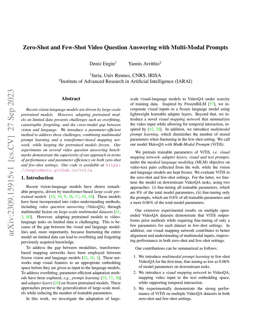 Recent vision-language models are driven by large-scale pretrained models. However, adapting pretrained models on limited data presents challenges such as overfitting, catastrophic forgetting, and the cross-modal gap between vision and language. We introduce a parameter-efficient method to address these challenges, combining multimodal prompt learning and a transformer-based mapping network, while keeping the pretrained models frozen. Our experiments on several video question answering benchmarks demonstrate the superiority of our approach in terms of performance and parameter efficiency on both zero-shot and few-shot settings. Our code is available at https://engindeniz.github.io/vitis.