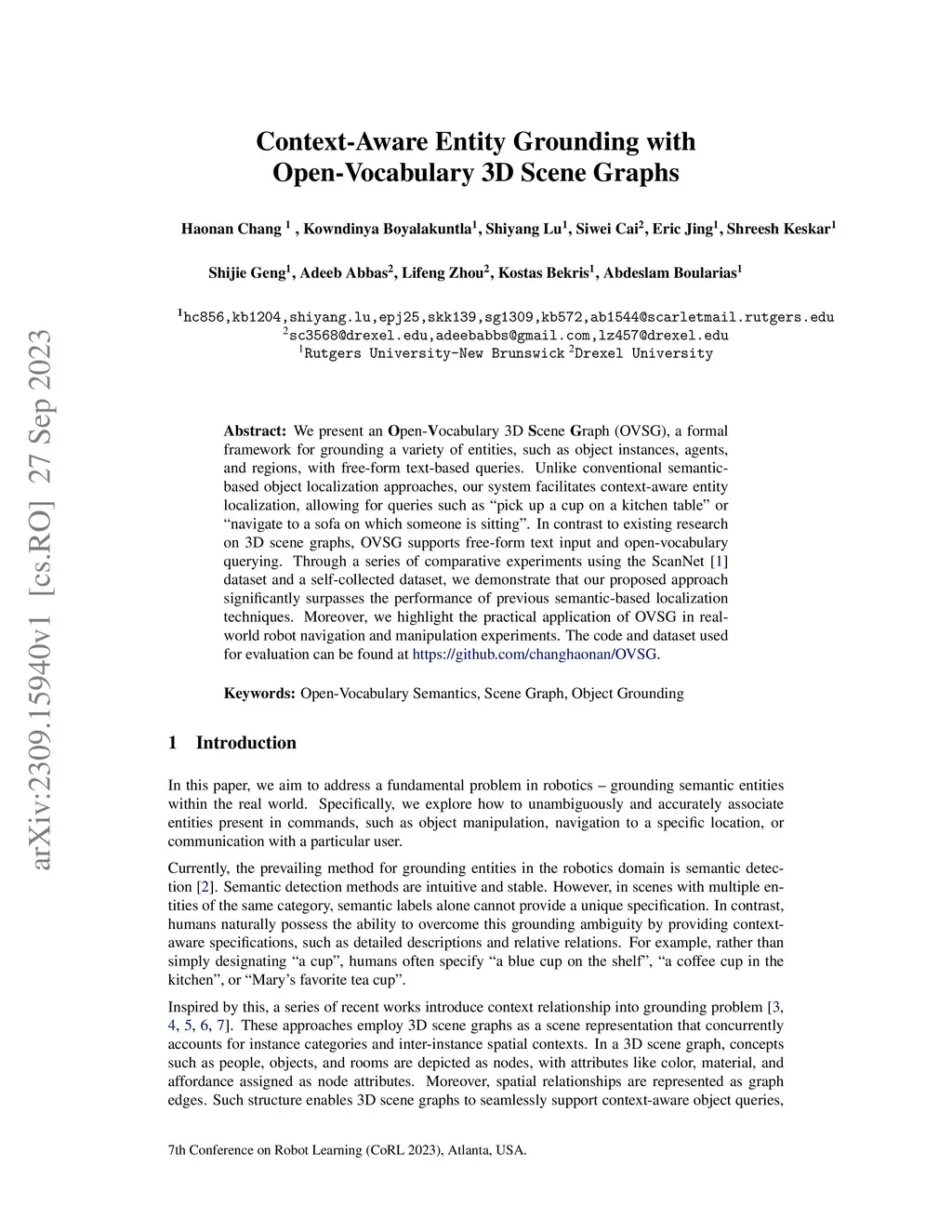 We present an Open-Vocabulary 3D Scene Graph (OVSG), a formal framework for grounding a variety of entities, such as object instances, agents, and regions, with free-form text-based queries. Unlike conventional semantic-based object localization approaches, our system facilitates context-aware entity localization, allowing for queries such as ``pick up a cup on a kitchen table" or ``navigate to a sofa on which someone is sitting". In contrast to existing research on 3D scene graphs, OVSG supports free-form text input and open-vocabulary querying. Through a series of comparative experiments using the ScanNet dataset and a self-collected dataset, we demonstrate that our proposed approach significantly surpasses the performance of previous semantic-based localization techniques. Moreover, we highlight the practical application of OVSG in real-world robot navigation and manipulation experiments.