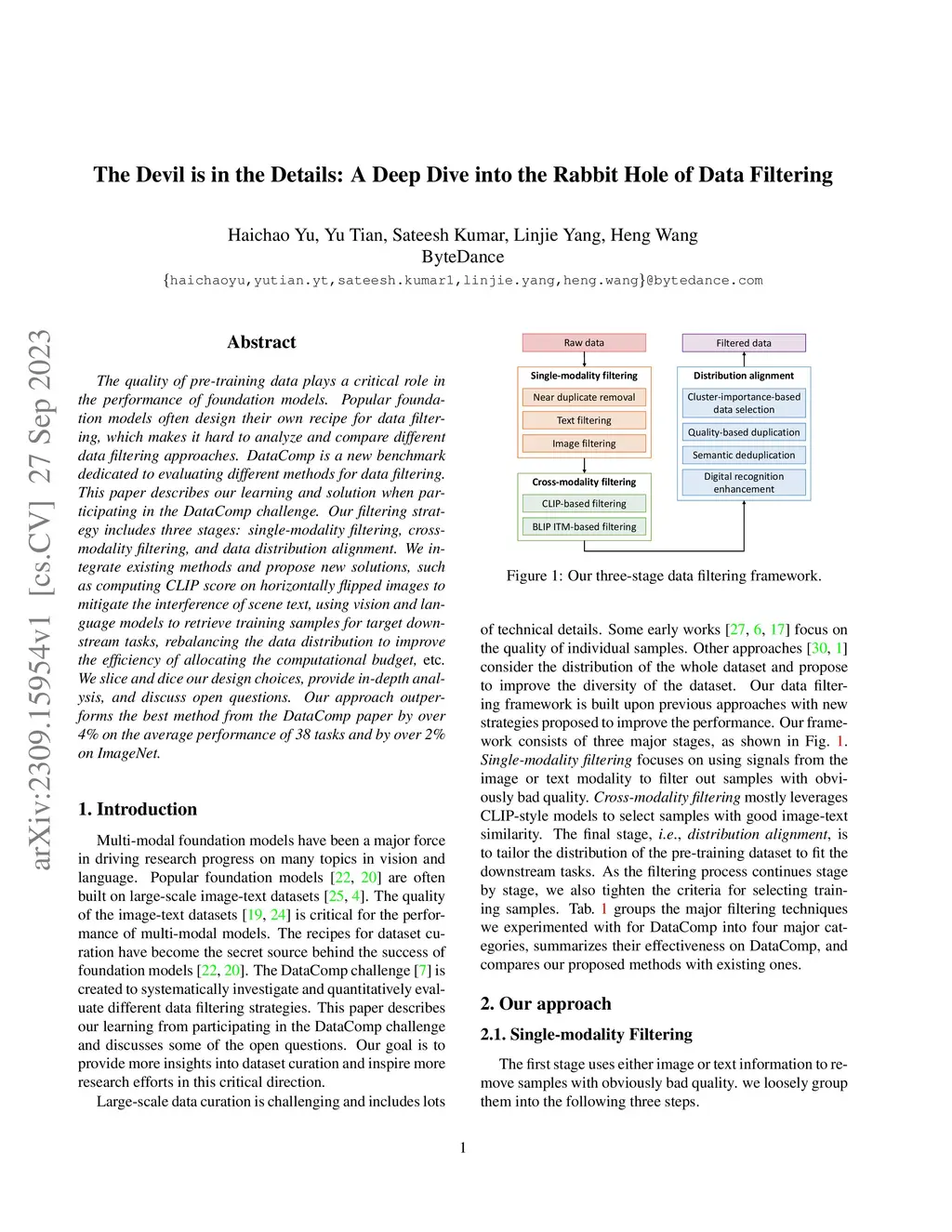 The quality of pre-training data plays a critical role in the performance of foundation models. Popular foundation models often design their own recipe for data filtering, which makes it hard to analyze and compare different data filtering approaches. DataComp is a new benchmark dedicated to evaluating different methods for data filtering. This paper describes our learning and solution when participating in the DataComp challenge. Our filtering strategy includes three stages: single-modality filtering, cross-modality filtering, and data distribution alignment. We integrate existing methods and propose new solutions, such as computing CLIP score on horizontally flipped images to mitigate the interference of scene text, using vision and language models to retrieve training samples for target downstream tasks, rebalancing the data distribution to improve the efficiency of allocating the computational budget, etc. We slice and dice our design choices, provide in-depth analysis, and discuss open questions. Our approach outperforms the best method from the DataComp paper by over 4% on the average performance of 38 tasks and by over 2% on ImageNet.