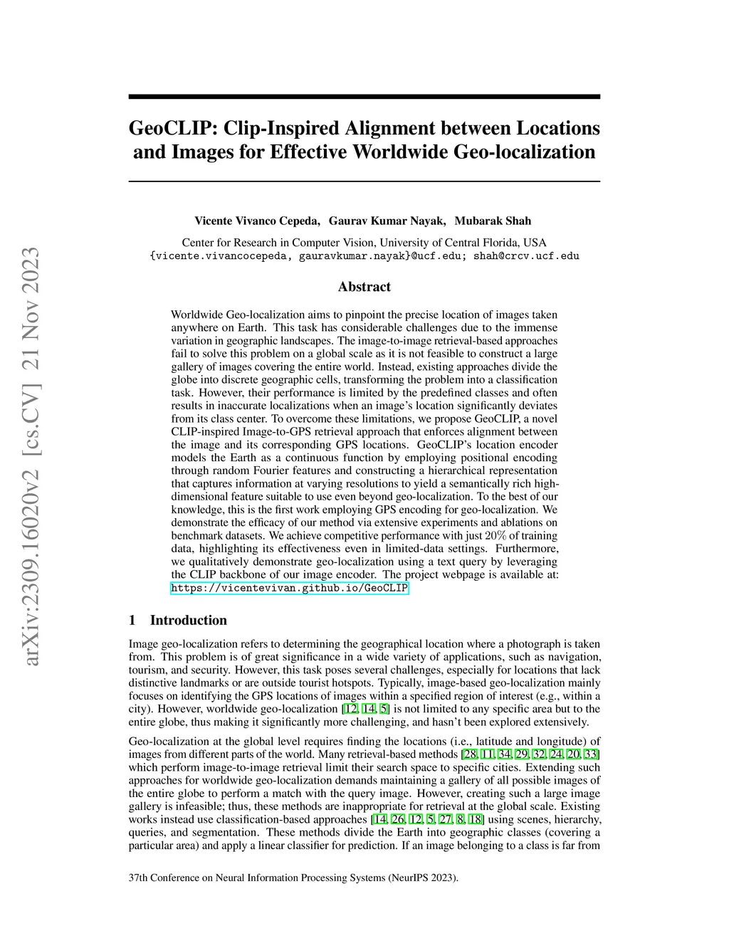 Worldwide Geo-localization aims to pinpoint the precise location of images taken anywhere on Earth. This task has considerable challenges due to immense variation in geographic landscapes. The image-to-image retrieval-based approaches fail to solve this problem on a global scale as it is not feasible to construct a large gallery of images covering the entire world. Instead, existing approaches divide the globe into discrete geographic cells, transforming the problem into a classification task. However, their performance is limited by the predefined classes and often results in inaccurate localizations when an image's location significantly deviates from its class center. To overcome these limitations, we propose GeoCLIP, a novel CLIP-inspired Image-to-GPS retrieval approach that enforces alignment between the image and its corresponding GPS locations. GeoCLIP's location encoder models the Earth as a continuous function by employing positional encoding through random Fourier features and constructing a hierarchical representation that captures information at varying resolutions to yield a semantically rich high-dimensional feature suitable to use even beyond geo-localization. To the best of our knowledge, this is the first work employing GPS encoding for geo-localization. We demonstrate the efficacy of our method via extensive experiments and ablations on benchmark datasets. We achieve competitive performance with just 20% of training data, highlighting its effectiveness even in limited-data settings. Furthermore, we qualitatively demonstrate geo-localization using a text query by leveraging CLIP backbone of our image encoder. The project webpage is available at: https://vicentevivan.github.io/GeoCLIP