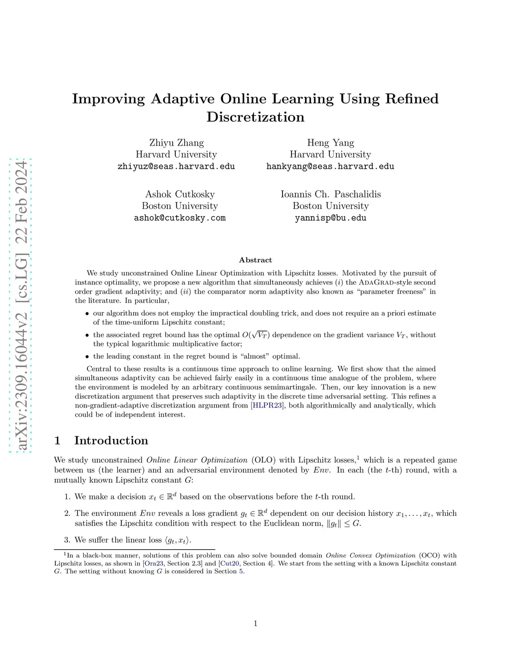We study unconstrained Online Linear Optimization with Lipschitz losses. Motivated by the pursuit of instance optimality, we propose a new algorithm that simultaneously achieves () the AdaGrad-style second order gradient adaptivity; and () the comparator norm adaptivity also known as "parameter freeness" in the literature. In particular, - our algorithm does not employ the impractical doubling trick, and does not require an a priori estimate of the time-uniform Lipschitz constant; - the associated regret bound has the optimal dependence on the gradient variance , without the typical logarithmic multiplicative factor; - the leading constant in the regret bound is "almost" optimal. Central to these results is a continuous time approach to online learning. We first show that the aimed simultaneous adaptivity can be achieved fairly easily in a continuous time analogue of the problem, where the environment is modeled by an arbitrary continuous semimartingale. Then, our key innovation is a new discretization argument that preserves such adaptivity in the discrete time adversarial setting. This refines a non-gradient-adaptive discretization argument from (Harvey et al., 2023), both algorithmically and analytically, which could be of independent interest.