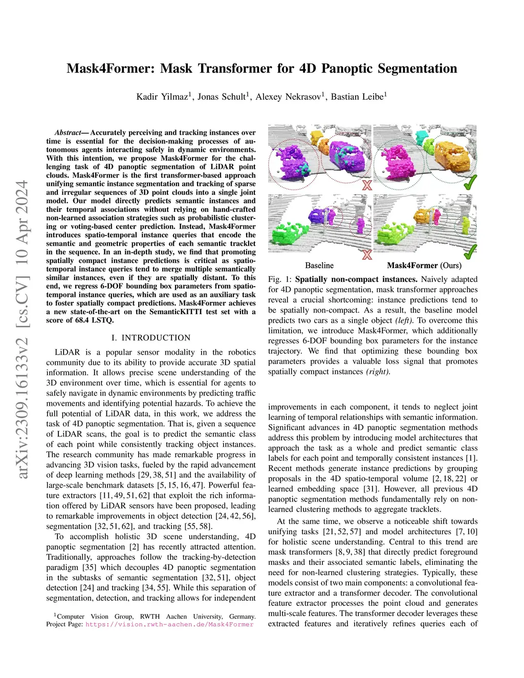 Accurately perceiving and tracking instances over time is essential for the decision-making processes of autonomous agents interacting safely in dynamic environments. With this intention, we propose Mask4Former for the challenging task of 4D panoptic segmentation of LiDAR point clouds. Mask4Former is the first transformer-based approach unifying semantic instance segmentation and tracking of sparse and irregular sequences of 3D point clouds into a single joint model. Our model directly predicts semantic instances and their temporal associations without relying on hand-crafted non-learned association strategies such as probabilistic clustering or voting-based center prediction. Instead, Mask4Former introduces spatio-temporal instance queries that encode the semantic and geometric properties of each semantic tracklet in the sequence. In an in-depth study, we find that promoting spatially compact instance predictions is critical as spatio-temporal instance queries tend to merge multiple semantically similar instances, even if they are spatially distant. To this end, we regress 6-DOF bounding box parameters from spatio-temporal instance queries, which are used as an auxiliary task to foster spatially compact predictions. Mask4Former achieves a new state-of-the-art on the SemanticKITTI test set with a score of 68.4 LSTQ.
