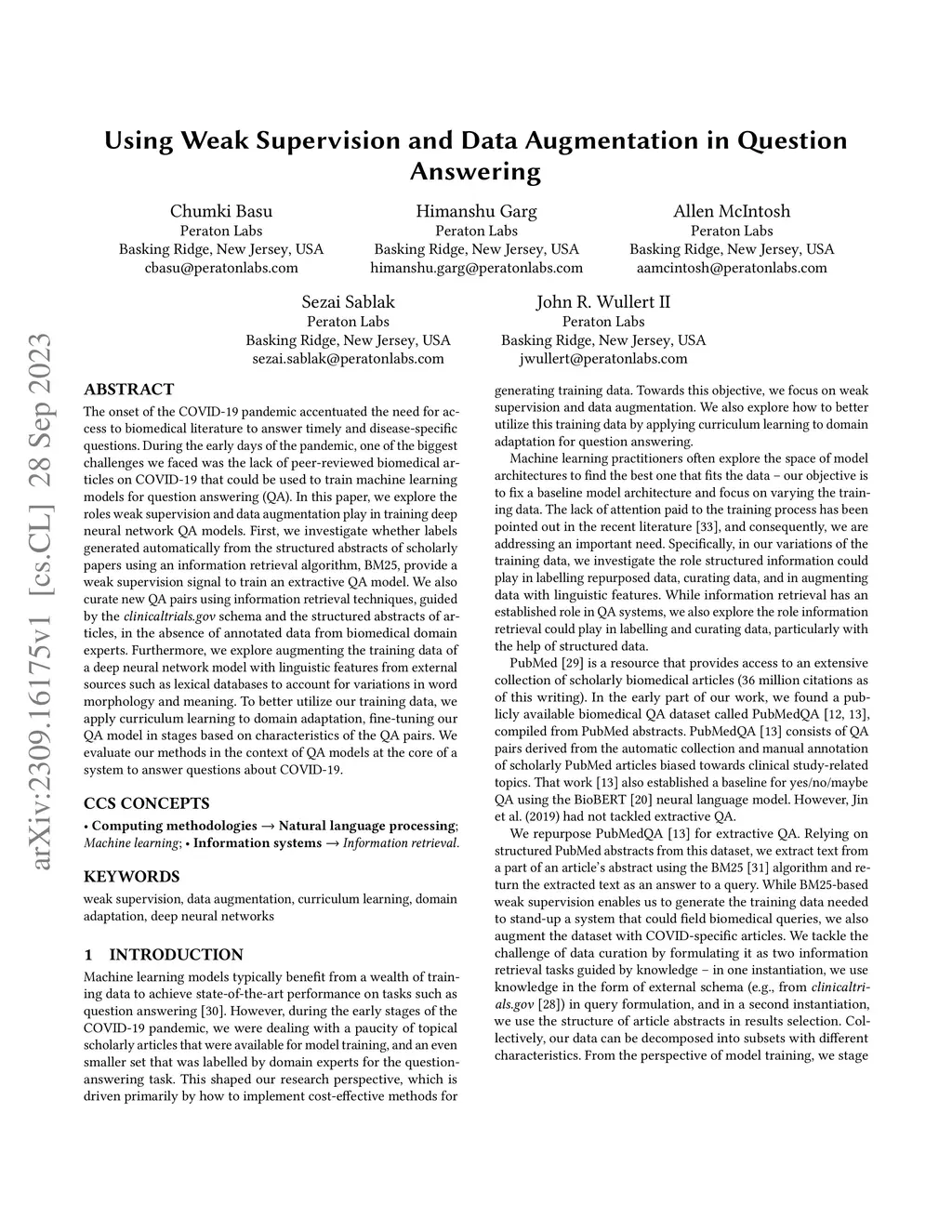 The onset of the COVID-19 pandemic accentuated the need for access to biomedical literature to answer timely and disease-specific questions. During the early days of the pandemic, one of the biggest challenges we faced was the lack of peer-reviewed biomedical articles on COVID-19 that could be used to train machine learning models for question answering (QA). In this paper, we explore the roles weak supervision and data augmentation play in training deep neural network QA models. First, we investigate whether labels generated automatically from the structured abstracts of scholarly papers using an information retrieval algorithm, BM25, provide a weak supervision signal to train an extractive QA model. We also curate new QA pairs using information retrieval techniques, guided by the clinicaltrials.gov schema and the structured abstracts of articles, in the absence of annotated data from biomedical domain experts. Furthermore, we explore augmenting the training data of a deep neural network model with linguistic features from external sources such as lexical databases to account for variations in word morphology and meaning. To better utilize our training data, we apply curriculum learning to domain adaptation, fine-tuning our QA model in stages based on characteristics of the QA pairs. We evaluate our methods in the context of QA models at the core of a system to answer questions about COVID-19.