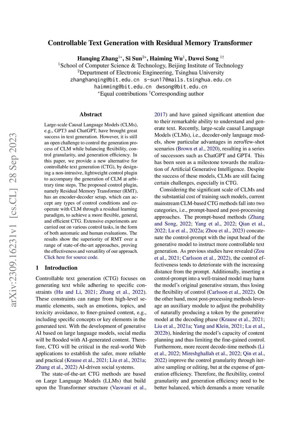 Large-scale Causal Language Models (CLMs), e.g., GPT3 and ChatGPT, have brought great success in text generation. However, it is still an open challenge to control the generation process of CLM while balancing flexibility, control granularity, and generation efficiency. In this paper, we provide a new alternative for controllable text generation (CTG), by designing a non-intrusive, lightweight control plugin to accompany the generation of CLM at arbitrary time steps. The proposed control plugin, namely Residual Memory Transformer (RMT), has an encoder-decoder setup, which can accept any types of control conditions and cooperate with CLM through a residual learning paradigm, to achieve a more flexible, general, and efficient CTG. Extensive experiments are carried out on various control tasks, in the form of both automatic and human evaluations. The results show the superiority of RMT over a range of state-of-the-art approaches, proving the effectiveness and versatility of our approach.