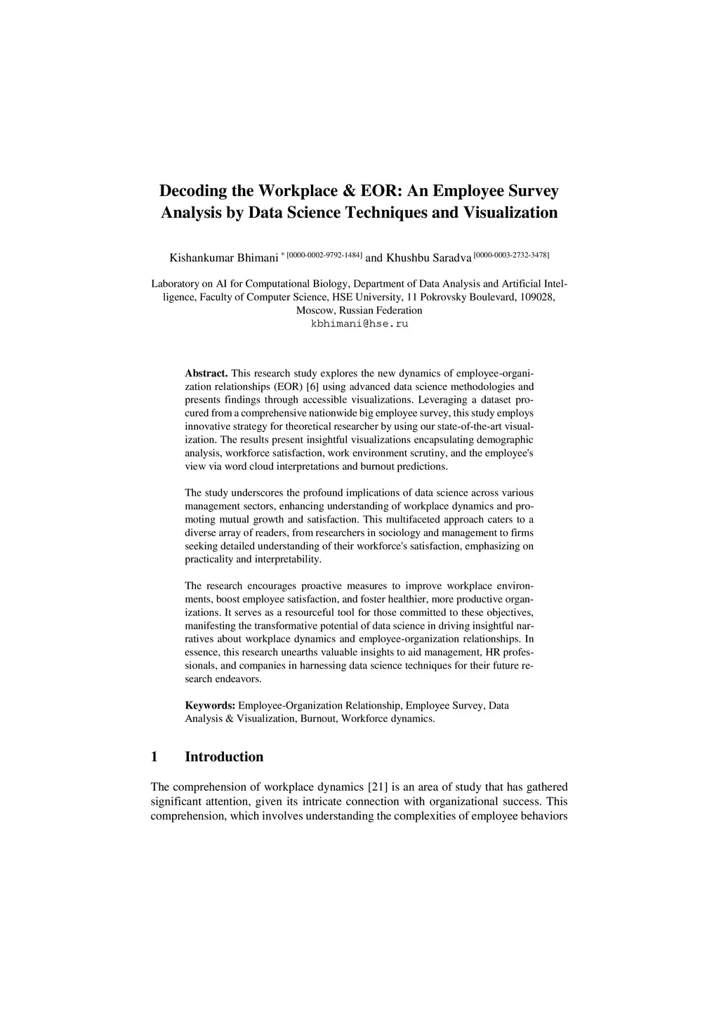 This research study explores the new dynamics of employee-organi-zation relationships (EOR) [6] using advanced data science methodologies and presents findings through accessible visualizations. Leveraging a dataset pro-cured from a comprehensive nationwide big employee survey, this study employs innovative strategy for theoretical researcher by using our state-of-the-art visual-ization. The results present insightful visualizations encapsulating demographic analysis, workforce satisfaction, work environment scrutiny, and the employee's view via word cloud interpretations and burnout predictions. The study underscores the profound implications of data science across various management sectors, enhancing understanding of workplace dynamics and pro-moting mutual growth and satisfaction. This multifaceted approach caters to a diverse array of readers, from researchers in sociology and management to firms seeking detailed understanding of their workforce's satisfaction, emphasizing on practicality and interpretability. The research encourages proactive measures to improve workplace environ-ments, boost employee satisfaction, and foster healthier, more productive organ-izations. It serves as a resourceful tool for those committed to these objectives, manifesting the transformative potential of data science in driving insightful nar-ratives about workplace dynamics and employee-organization relationships. In essence, this research unearths valuable insights to aid management, HR profes-sionals, and companies