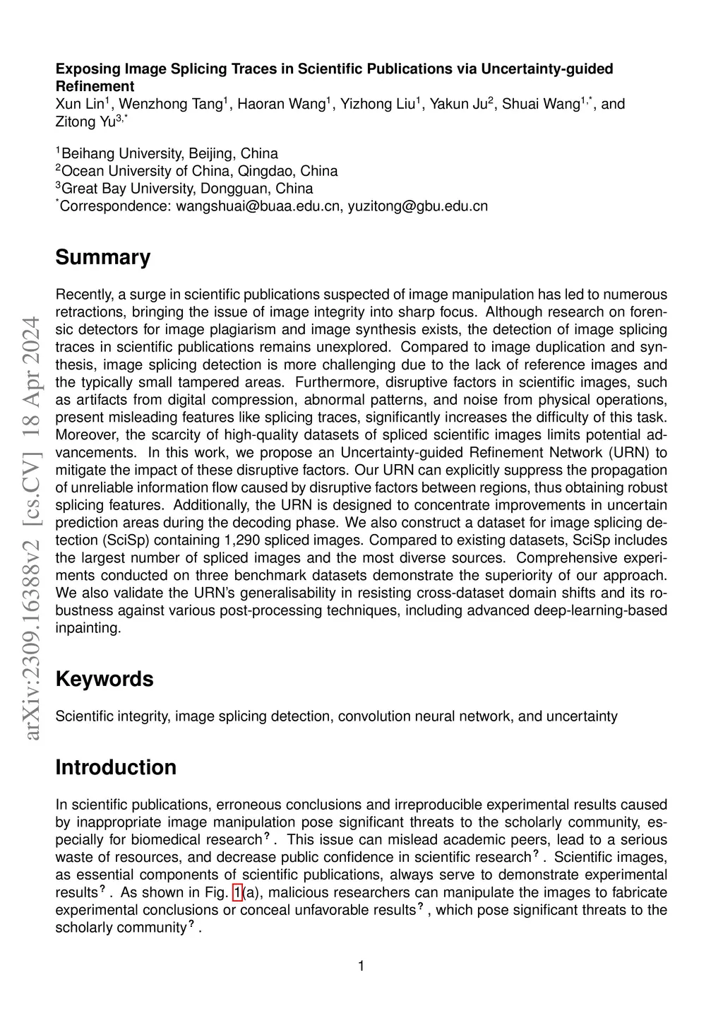 Recently, a surge in scientific publications suspected of image manipulation has led to numerous retractions, bringing the issue of image integrity into sharp focus. Although research on forensic detectors for image plagiarism and image synthesis exists, the detection of image splicing traces in scientific publications remains unexplored. Compared to image duplication and synthesis, image splicing detection is more challenging due to the lack of reference images and the typically small tampered areas. Furthermore, disruptive factors in scientific images, such as artifacts from digital compression, abnormal patterns, and noise from physical operations, present misleading features like splicing traces, significantly increasing the difficulty of this task. Moreover, the scarcity of high-quality datasets of spliced scientific images limits potential advancements. In this work, we propose an Uncertainty-guided Refinement Network (URN) to mitigate the impact of these disruptive factors. Our URN can explicitly suppress the propagation of unreliable information flow caused by disruptive factors between regions, thus obtaining robust splicing features. Additionally, the URN is designed to concentrate improvements in uncertain prediction areas during the decoding phase. We also construct a dataset for image splicing detection (SciSp) containing 1,290 spliced images. Compared to existing datasets, SciSp includes the largest number of spliced images and the most diverse sources. Comprehensive experiments conducted on three benchmark datasets demonstrate the superiority of our approach. We also validate the URN's generalisability in resisting cross-dataset domain shifts and its robustness against various post-processing techniques, including advanced deep-learning-based inpainting.