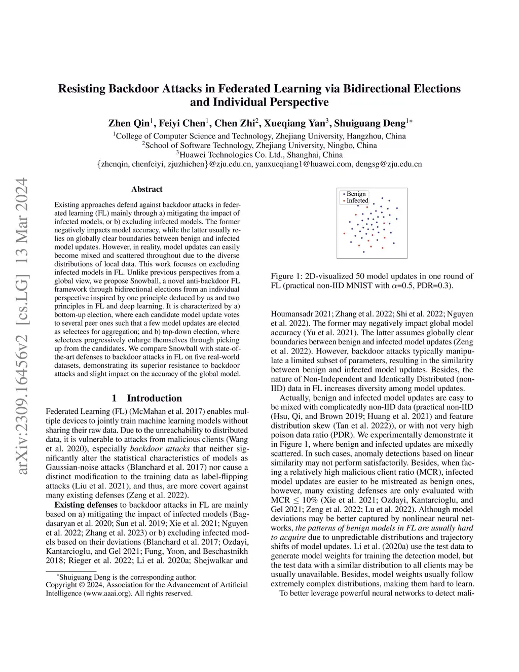 Existing approaches defend against backdoor attacks in federated learning (FL) mainly through a) mitigating the impact of infected models, or b) excluding infected models. The former negatively impacts model accuracy, while the latter usually relies on globally clear boundaries between benign and infected model updates. However, model updates are easy to be mixed and scattered throughout in reality due to the diverse distributions of local data. This work focuses on excluding infected models in FL. Unlike previous perspectives from a global view, we propose Snowball, a novel anti-backdoor FL framework through bidirectional elections from an individual perspective inspired by one principle deduced by us and two principles in FL and deep learning. It is characterized by a) bottom-up election, where each candidate model update votes to several peer ones such that a few model updates are elected as selectees for aggregation; and b) top-down election, where selectees progressively enlarge themselves through picking up from the candidates. We compare Snowball with state-of-the-art defenses to backdoor attacks in FL on five real-world datasets, demonstrating its superior resistance to backdoor attacks and slight impact on the accuracy of the global model.