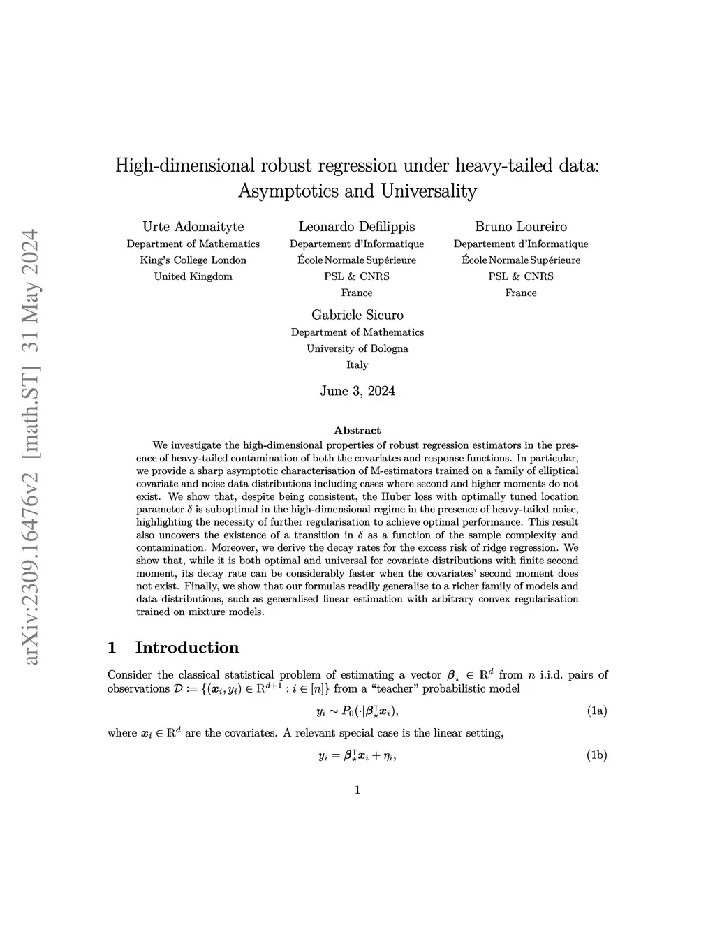 We investigate the high-dimensional properties of robust regression estimators in the presence of heavy-tailed contamination of both the covariates and response functions. In particular, we provide a sharp asymptotic characterisation of M-estimators trained on a family of elliptical covariate and noise data distributions including cases where second and higher moments do not exist. We show that, despite being consistent, the Huber loss with optimally tuned location parameter is suboptimal in the high-dimensional regime in the presence of heavy-tailed noise, highlighting the necessity of further regularisation to achieve optimal performance. This result also uncovers the existence of a transition in as a function of the sample complexity and contamination. Moreover, we derive the decay rates for the excess risk of ridge regression. We show that, while it is both optimal and universal for covariate distributions with finite second moment, its decay rate can be considerably faster when the covariates' second moment does not exist. Finally, we show that our formulas readily generalise to a richer family of models and data distributions, such as generalised linear estimation with arbitrary convex regularisation trained on mixture models.