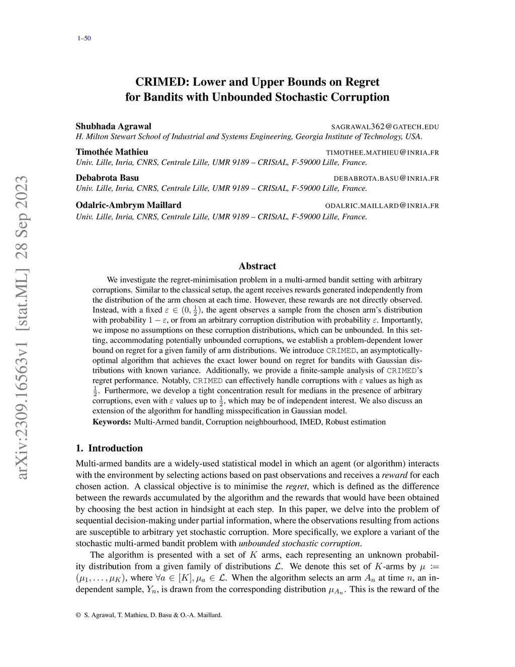 We investigate the regret-minimisation problem in a multi-armed bandit setting with arbitrary corruptions. Similar to the classical setup, the agent receives rewards generated independently from the distribution of the arm chosen at each time. However, these rewards are not directly observed. Instead, with a fixed , the agent observes a sample from the chosen arm's distribution with probability , or from an arbitrary corruption distribution with probability . Importantly, we impose no assumptions on these corruption distributions, which can be unbounded. In this setting, accommodating potentially unbounded corruptions, we establish a problem-dependent lower bound on regret for a given family of arm distributions. We introduce CRIMED, an asymptotically-optimal algorithm that achieves the exact lower bound on regret for bandits with Gaussian distributions with known variance. Additionally, we provide a finite-sample analysis of CRIMED's regret performance. Notably, CRIMED can effectively handle corruptions with values as high as . Furthermore, we develop a tight concentration result for medians in the presence of arbitrary corruptions, even with values up to , which may be of independent interest. We also discuss an extension of the algorithm for handling misspecification in Gaussian model.