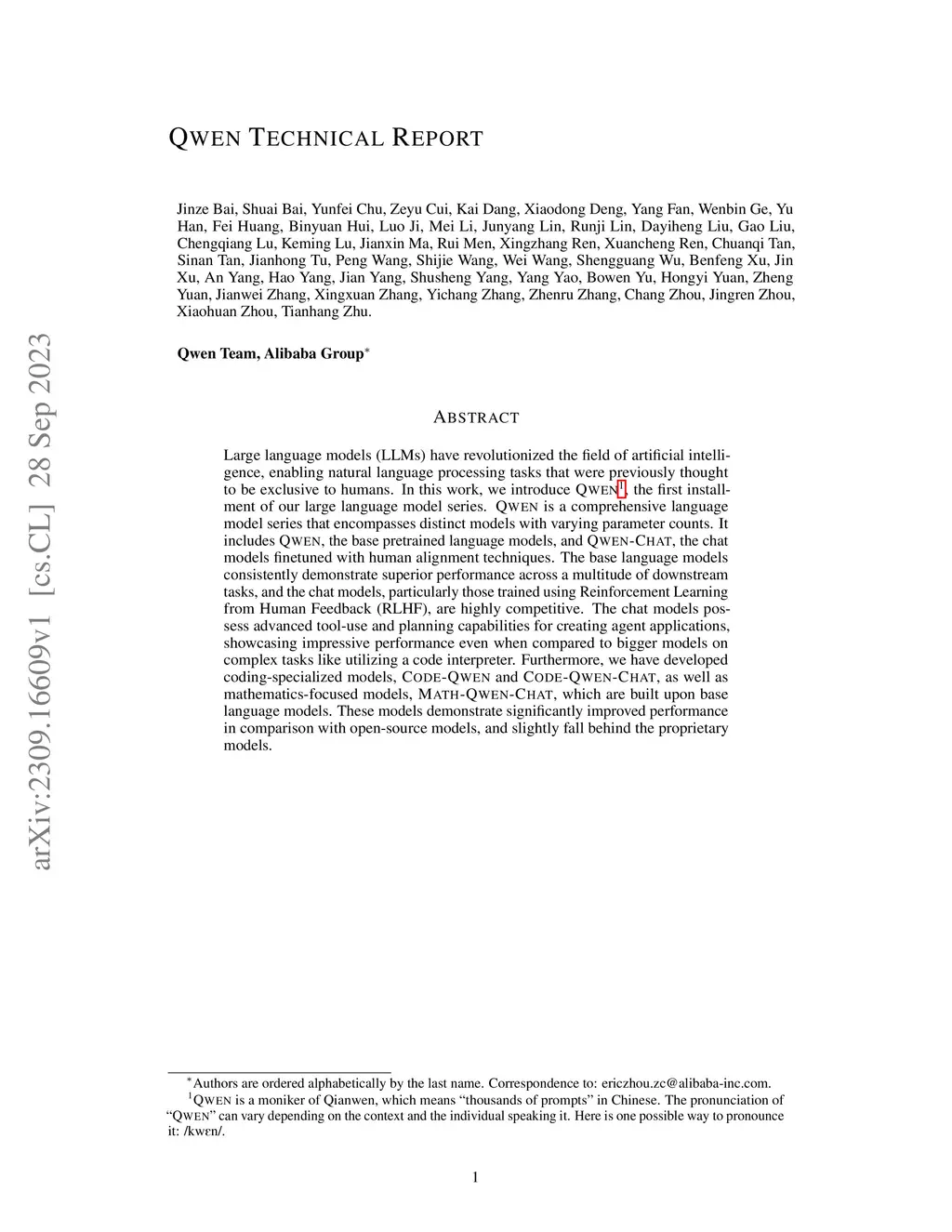 Large language models (LLMs) have revolutionized the field of artificial intelligence, enabling natural language processing tasks that were previously thought to be exclusive to humans. In this work, we introduce Qwen, the first installment of our large language model series. Qwen is a comprehensive language model series that encompasses distinct models with varying parameter counts. It includes Qwen, the base pretrained language models, and Qwen-Chat, the chat models finetuned with human alignment techniques. The base language models consistently demonstrate superior performance across a multitude of downstream tasks, and the chat models, particularly those trained using Reinforcement Learning from Human Feedback (RLHF), are highly competitive. The chat models possess advanced tool-use and planning capabilities for creating agent applications, showcasing impressive performance even when compared to bigger models on complex tasks like utilizing a code interpreter. Furthermore, we have developed coding-specialized models, Code-Qwen and Code-Qwen-Chat, as well as mathematics-focused models, Math-Qwen-Chat, which are built upon base language models. These models demonstrate significantly improved performance in comparison with open-source models, and slightly fall behind the proprietary models.