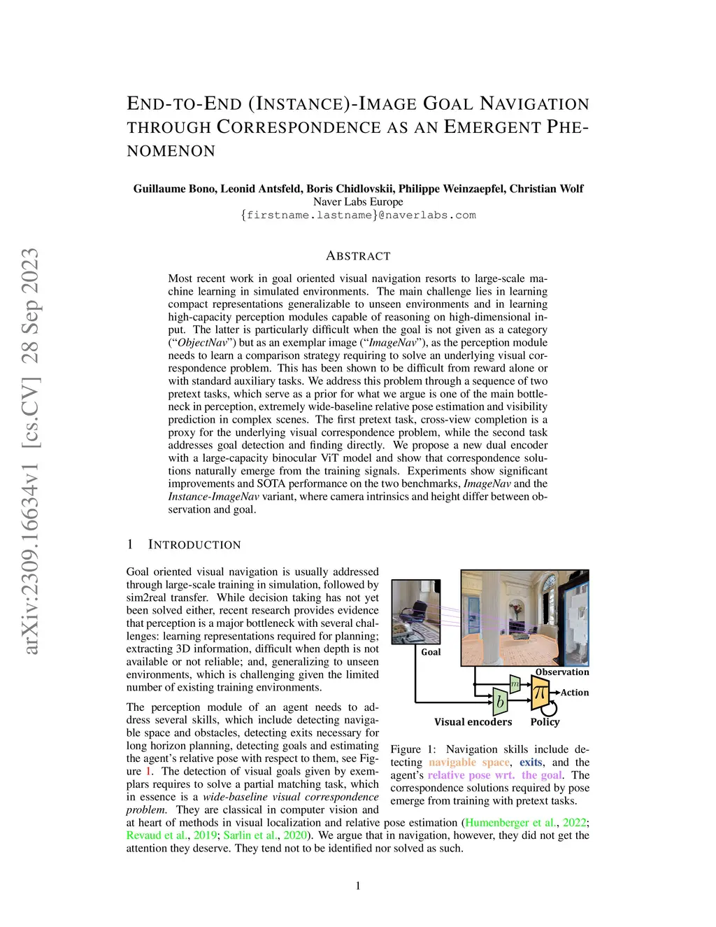 Most recent work in goal oriented visual navigation resorts to large-scale machine learning in simulated environments. The main challenge lies in learning compact representations generalizable to unseen environments and in learning high-capacity perception modules capable of reasoning on high-dimensional input. The latter is particularly difficult when the goal is not given as a category ("ObjectNav") but as an exemplar image ("ImageNav"), as the perception module needs to learn a comparison strategy requiring to solve an underlying visual correspondence problem. This has been shown to be difficult from reward alone or with standard auxiliary tasks. We address this problem through a sequence of two pretext tasks, which serve as a prior for what we argue is one of the main bottleneck in perception, extremely wide-baseline relative pose estimation and visibility prediction in complex scenes. The first pretext task, cross-view completion is a proxy for the underlying visual correspondence problem, while the second task addresses goal detection and finding directly. We propose a new dual encoder with a large-capacity binocular ViT model and show that correspondence solutions naturally emerge from the training signals. Experiments show significant improvements and SOTA performance on the two benchmarks, ImageNav and the Instance-ImageNav variant, where camera intrinsics and height differ between observation and goal.